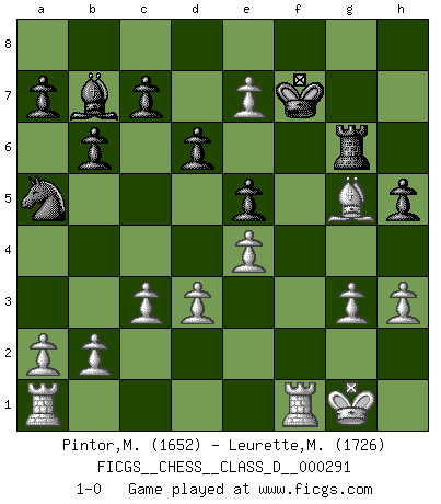 Last move : 1-0 2023 January 4 13:26:12 [Event "FICGS__CHESS__CLASS_D__000291"] [Site "FICGS"] [Date "2022.12.26"] [Round "1"] [White "Pintor,Manuel"] [Black "Leurette,Marc-Antoine"] [Result "1-0"] [WhiteElo "1652"] [BlackElo "1726"] 1.e4 e5 2.f4 d6 3.Nf3 Nc6 4.Bc4 Be7 5.O-O h6 6.c3 Bf6 7.f5 b6 8.g3 g5 9.h3 h5 10.Bd5 Nge7 11.Bb3 Bb7 12.d3 Rh7 13.Nxg5 Bxg5 14.Bxg5 Qd7 15.Nd2 O-O-O 16.Nf3 Rg8 17.Bh4 R8g7 18.Ng5 Rh8 19.Nxf7 R8h7 20.Be6 Rxf7 21.Bxd7+ Kxd7 22.Qb3 Na5 23.Qe6+ Ke8 24.f6 Rh6 25.Bg5 Rg6 26.Qxf7+ Kxf7 27.fxe7 1-0 Follow this game move after move (download)Many have become Chess Masters, no one has become the Master of Chess. (Siegbert Tarrasch) Ein Remis kann durch Wiederholung von drei Zügen oder durch einen schlechte Zug erreicht werden. (Savielly Grigorievitsch Tartakower) Todavía soy una víctima del Ajedrez. Tiene toda la belleza del arte y mucho mas. No puede ser comercializado. El Ajedrez es mas puro que el arte en su posición social. (Marcel Duchamp) Les échecs c'est le défi de l'alpiniste, toujours plus haut, prêt à tout pour monter à l'assaut du Roi ennemi. Les échecs, c'est de la musique en mouvement, un ballet majestueux pour les yeux. C'est de la poésie composée par les fantômes du passé qui au même titre que Rimbaud ou Verlaine méritent notre admiration. Les échecs, c'est de la peinture ou le moindre mouvement modifie le tableau pour en faire un Picasso ou un Van Gogh. Les échecs, c'est tout et rien, c'est la vie et la mort. Jjulie33 sur le forum de France-Echecs. Internal peace cannot coexist with external war. (Don Groves)
