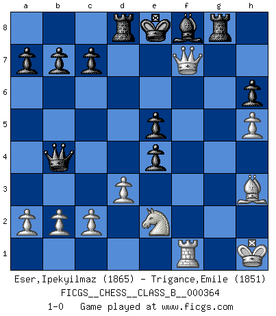 Last move : 1-0 2023 February 2 23:20:58 [Event "FICGS__CHESS__CLASS_B__000364"] [Site "FICGS"] [Date "2022.12.29"] [Round "1"] [White "Eser,Ipekyilmaz"] [Black "Trigance,Emile"] [Result "1-0"] [WhiteElo "1865"] [BlackElo "1851"] 1.g3 g6 2.Bg2 Bg7 3.Kf1 d5 4.h3 e5 5.h4 Be6 6.h5 Nc6 7.d3 g5 8.Nc3 h6 9.e3 Qd7 10.f3 Nge7 11.f4 Nf5 12.Nge2 gxf4 13.exf4 Rg8 14.g4 Nfe7 15.f5 Bxf5 16.gxf5 Qxf5+ 17.Kg1 Qg4 18.Qf1 Bf8 19.Rh2 Nb4 20.Kh1 Qd7 21.Bh3 Qc6 22.Rf2 f5 23.Rxf5 Nxf5 24.Qxf5 Qd6 25.Bd2 Qe7 26.Rf1 Rd8 27.Ne4 dxe4 28.Bxb4 Qxb4 29.Qf7+ 1-0 Follow this game move after move (download)Combinations have always been the most intriguing aspect of Chess. The masters look for them, the public applauds them, the critics praise them. It is because combinations are possible that Chess is more than a lifeless mathematical exercise. They are the poetry of the game; they are to Chess what melody is to music. They represent the triumph of mind over matter. (Reuben Fine) Dein Körper muss in Topform sein. Dein Schach verfällt, wenn dein Körper verfällt. Der Körper kann nicht vom Geist getrennt werden. (Robert James Fischer) El Jaque al descubierto es el bombardero del tablero. (Reuben Fine) Les Echecs mettent en conflit, non pas deux intelligences, mais deux volontés. (Lasker) Winning isn't everything... but losing is nothing. (Mednis)