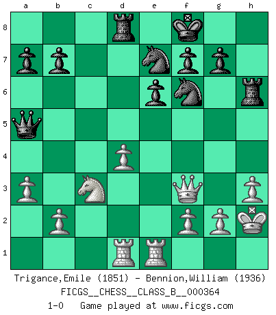 Last move : 1-0 2023 April 2 3:20:39 [Event "FICGS__CHESS__CLASS_B__000364"] [Site "FICGS"] [Date "2022.12.29"] [Round "1"] [White "Trigance,Emile"] [Black "Bennion,William"] [Result "1-0"] [WhiteElo "1851"] [BlackElo "1936"] 1.e4 c5 2.c3 d5 3.exd5 Qxd5 4.d4 Nc6 5.Nf3 Bg4 6.Be2 cxd4 7.cxd4 e6 8.Nc3 Qa5 9.O-O Nf6 10.h3 Bh5 11.a3 Bd6 12.Be3 Kf8 13.Nh2 Bxe2 14.Qxe2 Bxh2+ 15.Kxh2 h6 16.Qf3 Rd8 17.Rad1 Ne7 18.Bxh6 Rxh6 19.Rfe1 1-0 This chess game has been lost on time (started : 2022.12.29 1:25:22) Follow this game move after move (download)That's what Chess is all about. One day you give your opponent a lesson, the next day he gives you one. (Bobby Fischer) Die Partien sind immer verschieden, die Interviews immer die gleichen. (Garry Kasparov) No hay precio que sea tan grande por la cabellera del Rey enemigo. (Koblentz) Si je n'étais pas joueur d'échecs, je serais le meilleur dans quelque chose d'autre. (Anatoli Karpov) You can think I'm wrong, but that's no reason to quit thinking. (Gregory House, House M.D.)