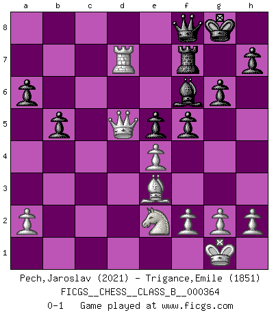 Last move : 0-1 2023 July 31 17:49:16 [Event "FICGS__CHESS__CLASS_B__000364"] [Site "FICGS"] [Date "2022.12.29"] [Round "1"] [White "Pech,Jaroslav"] [Black "Trigance,Emile"] [Result "0-1"] [WhiteElo "2021"] [BlackElo "1851"] 1.d4 Nf6 2.c4 g6 3.Nc3 d5 4.cxd5 Nxd5 5.e4 Nxc3 6.bxc3 Bg7 7.Bc4 O-O 8.Ne2 c5 9.O-O Nc6 10.Be3 Na5 11.Bd3 b6 12.Qd2 Nc6 13.Bb5 Bb7 14.Rac1 Rc8 15.Rfd1 cxd4 16.cxd4 a6 17.Bxc6 Bxc6 18.d5 Bb7 19.Rxc8 Bxc8 20.Rc1 Bb7 21.Bf4 b5 22.Rc7 Bc8 23.Ra7 e5 24.Be3 f5 25.d6 Rf7 26.Qd5 Qe8 27.Re7 Qf8 28.d7 Bxd7 29.Rxd7 Bf6 0-1 This chess game has been lost on time (started : 2022.12.29 1:25:22) Follow this game move after move (download)War is the child of passion, passion is the child of narcissism and narcissism is the child. (...) Another game ? (Thibault de Vassal) Obwohl ich alt bin, darf mir niemand den Finger in den Mund stecken, sonst beisse ich. (Wilhelm Steinitz) Todavía soy una víctima del Ajedrez. Tiene toda la belleza del arte y mucho mas. No puede ser comercializado. El Ajedrez es mas puro que el arte en su posición social. (Marcel Duchamp) Tous ces prétendus hommes politiques sont les pions, les Cavaliers, les Tours ou les Fous d'une partie d'échecs qui se jouera tant qu'un hasard ne renversera pas l'échiquier. (Honoré de Balzac) Fortune favours the audacious. (Desiderius Erasmus)