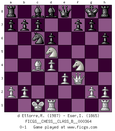 Last move : 0-1 2023 March 20 16:29:51 [Event "FICGS__CHESS__CLASS_B__000364"] [Site "FICGS"] [Date "2022.12.29"] [Round "1"] [White "d Ettorre,Rodolfo"] [Black "Eser,Ipekyilmaz"] [Result "0-1"] [WhiteElo "1987"] [BlackElo "1865"] 1.e4 Nf6 2.e5 Nd5 3.d4 d6 4.c4 Nb6 5.exd6 exd6 6.Nc3 Be7 7.Qf3 Kf8 8.Be3 h6 9.O-O-O Nc6 10.Nge2 Nxc4 11.Nf4 Nxe3 12.fxe3 Kg8 13.Bc4 Qe8 14.Ncd5 Bd8 0-1 Follow this game move after move (download)Chess is imagination. (David Bronstein) Wenn es im Universum noch irgendwo intelligente Lebewesen gibt, dann kennen sie Go. (Emanuel Lasker) Personalmente, yo prefiero mirar hacia el futuro en donde un programa de computadora gane el título mundial de Ajedrez. La humanidad necesita una lección de humildad. (Richard Dawkings) On est toujours la mazette de quelqu'un d'autre. (Anonyme) Everything in life is luck. (Donald Trump)