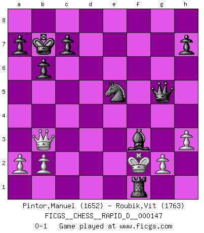 Last move : 0-1 2023 February 18 21:18:53 [Event "FICGS__CHESS__RAPID_D__000147"] [Site "FICGS"] [Date "2022.12.29"] [Round "1"] [White "Pintor,Manuel"] [Black "Roubik,Vit"] [Result "0-1"] [WhiteElo "1652"] [BlackElo "1763"] 1.e4 e6 2.f4 b6 3.Nf3 Bb7 4.Nc3 Nc6 5.Bc4 Qe7 6.d4 O-O-O 7.O-O g6 8.Ne5 Bg7 9.f5 Bxe5 10.dxe5 Qc5+ 11.Kh1 Qxc4 12.fxe6 dxe6 13.Qe1 Rd7 14.Bf4 Kb8 15.Rd1 Rxd1 16.Qxd1 Nge7 17.Qd3 Qb4 18.Nd1 Rd8 19.Qc3 Qxe4 20.Ne3 Nf5 21.Nxf5 Qxf5 22.h3 g5 23.Qg3 gxf4 24.Qxf4 Qxc2 25.Rf2 Rd1+ 26.Kh2 Qb1 27.Qxf7 Rh1+ 28.Kg3 Nxe5 29.Qxe6 Qd3+ 30.Kh4 Qd4+ 31.Kg3 Qe3+ 32.Rf3 Bxf3 33.Qg8+ Kb7 34.Qb3 Qg5+ 35.Kf2 Rf1+ 0-1 Follow this game move after move (download)Bobby just drops the pieces and they fall on the right squares. (Miguel Najdorf) Frage: Wie viele Autos haben Sie schon zerstört? - Antwort: Nur zwei. (Loek van Wely) Bobby Fischer es el mas grande genio de Ajedrez de todos los tiempos. (Alexander Kotov) Les Echecs mettent en conflit, non pas deux intelligences, mais deux volontés. (Lasker) The difference between stupidity and genius is that genius has its limits. (Murphy)