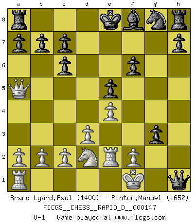 Last move : 0-1 2023 January 4 4:1:44 [Event "FICGS__CHESS__RAPID_D__000147"] [Site "FICGS"] [Date "2022.12.29"] [Round "1"] [White "Brand Lyard,Paul"] [Black "Pintor,Manuel"] [Result "0-1"] [WhiteElo "1400"] [BlackElo "1652"] 1.e4 e5 2.Nf3 Nc6 3.Bb5 Qf6 4.Bxc6 dxc6 5.d3 Bg4 6.Bg5 Qg6 7.Qd2 f6 8.Bh4 Qh5 9.O-O Bxf3 10.g3 g5 11.Qa5 gxh4 12.Nd2 Be2 13.Rfe1 hxg3 14.Rxe2 Qxh2+ 15.Kf1 Qh1+ 0-1 Follow this game move after move (download)Life is like a game of Chess, changing with each move. (Chinese proverb) Heutzutage gewinnt im Turnier nicht derjenige Spieler, der weitreichende Pläne entwirft, sondern einfach jener, der Zug um Zug kämpft. (David Bronstein) Fischer es una tragedia del Ajedrez Americano a la par con Morphy y Pillsbury. (Mig Greengard) Les échecs sont un jeu terrible. Si vous n'avez pas le centre, votre adversaire a une position plus libre. Par contre, si vous avez le centre, alors vous avez vraiment quelque chose pour laquelle vous inquiéter ! (Siegbert Tarrasch) Yoga is 99% practice and 1% knowledge. (Sri Krishna Pattabhi Jois)