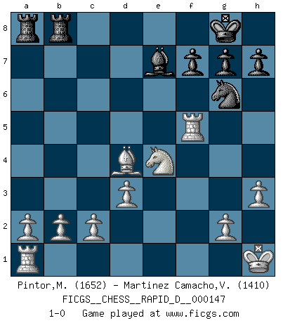 Last move : 1-0 2023 February 22 10:30:23 [Event "FICGS__CHESS__RAPID_D__000147"] [Site "FICGS"] [Date "2022.12.29"] [Round "1"] [White "Pintor,Manuel"] [Black "Martinez Camacho,Victor Hugo"] [Result "1-0"] [WhiteElo "1652"] [BlackElo "1410"] 1.e4 e5 2.f4 d5 3.exd5 c6 4.dxc6 Nxc6 5.Nf3 Bg4 6.fxe5 Nxe5 7.Be2 Nxf3+ 8.Bxf3 Bxf3 9.Qxf3 Nf6 10.O-O Be7 11.Qxb7 O-O 12.d3 Qb6+ 13.Qxb6 axb6 14.Nc3 Bc5+ 15.Kh1 Ng4 16.Ne4 Be7 17.h3 Ne5 18.Be3 Ng6 19.Rf3 Ne5 20.Rf5 Ng6 21.Bxb6 Rfb8 22.Bd4 1-0 This chess game has been lost on time (started : 2022.12.29 5:31:53) Follow this game move after move (download)Excellence at Chess is one mark of a scheming mind. (Sir Arthur Conan Doyle) Es gibt Leute, die glauben, alles wäre vernünftig, was man mit einem ernsthaften Gesicht tut. (Georg Christoph Lichtenberg) Coloca el contenido del tablero de Ajedrez en un sombrero, agita las piezas vigorosamente, derrámalas en el tablero desde una altura de medio metro y así obtienes el estilo de Wilhelm Steinitz. (H. E. Bird) L'attaque fait le spectacle, la défense gagne les matchs. (Dicton footballistique) Hold em is to stud what chess is to checkers. (Johnny Moss)