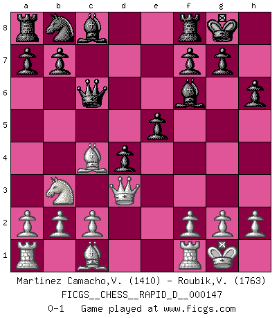 Last move : 0-1 2023 March 1 11:44:23 [Event "FICGS__CHESS__RAPID_D__000147"] [Site "FICGS"] [Date "2022.12.29"] [Round "1"] [White "Martinez Camacho,Victor Hugo"] [Black "Roubik,Vit"] [Result "0-1"] [WhiteElo "1410"] [BlackElo "1763"] 1.e4 e6 2.d4 d5 3.Nd2 c5 4.exd5 Qxd5 5.Ngf3 cxd4 6.Bd3 Nf6 7.O-O Be7 8.Bc4 Qd6 9.Nb3 e5 10.Ng5 O-O 11.Qd3 h6 12.Ne4 Qc6 13.Nxf6+ Bxf6 0-1 This chess game has been lost on time (started : 2022.12.29 5:31:53) Follow this game move after move (download)Kasparov : J'adoube , Ivanchuk : S'il vous plaît ! (Garry Kasparov & Vassily Ivanchuk, Linares 1997) Wenn ich einen Club besuche, sind die Spieler stumm vor Staunen. (José Raúl Capablanca) Un mal plan es mejor que no tener ningún plan. (Frank Marshall) Les échecs c'est le défi de l'alpiniste, toujours plus haut, prêt à tout pour monter à l'assaut du Roi ennemi. Les échecs, c'est de la musique en mouvement, un ballet majestueux pour les yeux. C'est de la poésie composée par les fantômes du passé qui au même titre que Rimbaud ou Verlaine méritent notre admiration. Les échecs, c'est de la peinture ou le moindre mouvement modifie le tableau pour en faire un Picasso ou un Van Gogh. Les échecs, c'est tout et rien, c'est la vie et la mort. Jjulie33 sur le forum de France-Echecs. Computers are like Old Testament gods; lots of rules and no mercy. (Joseph Campbell)
