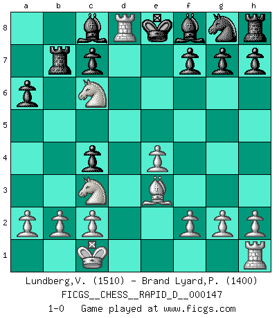 Last move : 1-0 2023 January 11 3:21:32 [Event "FICGS__CHESS__RAPID_D__000147"] [Site "FICGS"] [Date "2022.12.29"] [Round "1"] [White "Lundberg,Viktor"] [Black "Brand Lyard,Paul"] [Result "1-0"] [WhiteElo "1510"] [BlackElo "1400"] 1.e4 e5 2.Nf3 Nc6 3.Bb5 d6 4.d4 a6 5.Bxc6+ bxc6 6.dxe5 dxe5 7.Qxd8+ Kxd8 8.Nxe5 Ke8 9.Be3 c5 10.Nc3 Rb8 11.O-O-O c4 12.Nc6 Rb7 13.Rd8+ 1-0 Follow this game move after move (download)Do you realize Fischer almost never has any bad pieces? He exchanges them, and the bad pieces remain with his opponents. (Yuri Balashov) Wenn Spassky eine Figur opfert kannst du genauso gut aufgeben. Aber wenn Tal eine Figur opfert, spiel weiter. Er könnte noch eine weitere opfern, und dann ... wer weiß? (Miguel Najdorf) Yo creo que el Ajedrez posee una magia que es también una ayuda en la edad avanzada. Una rodilla reumática es olvidada durante una partida de Ajedrez y otros eventos pueden parecer algo sin importancia comparada a una catástrofe en el tablero de Ajedrez. (Vlastimil Hort) Toutes choses étant égales, c'est la conviction qui gagne. Alliée à une volonté de vaincre, elle sert de détonateur, suscite des idées, disperse les doutes et aide à penser clairement. (Robert Fischer) The Internet is the world's largest library. It's just that all the books are on the floor. (John Allen Paulos)