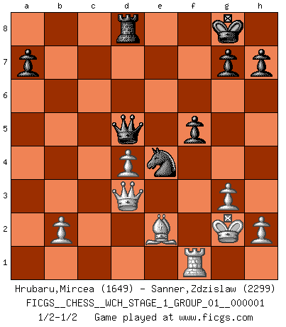 Last move : 1/2-1/2 2006 September 13 22:52:8 [Event "FICGS__CHESS__WCH_STAGE_1_GROUP_01__000001"] [Site "FICGS"] [Date "2006.07.01"] [Round "1"] [White "Hrubaru,Mircea"] [Black "Sanner,Zdzislaw"] [Result "1/2-1/2"] [WhiteElo "1649"] [BlackElo "2299"] 1.e4 e5 2.Nf3 Nf6 3.Nxe5 d6 4.Nf3 Nxe4 5.d4 d5 6.Bd3 f5 7.Ne5 Be6 8.Bf4 Nd7 9.f3 Nef6 10.O-O Nh5 11.Nxd7 Nxf4 12.Nxf8 Rxf8 13.Qd2 Qd6 14.Nc3 c6 15.Rfe1 Kf7 16.Na4 b6 17.Bf1 Kg8 18.g3 Ng6 19.f4 Rfe8 20.a3 Nf8 21.Re2 Nd7 22.Rae1 Nf6 23.Re5 Rad8 24.Be2 Ne4 25.Qd3 b5 26.Nc3 b4 27.axb4 Qxb4 28.Rb1 c5 29.Kg2 Bf7 30.dxc5 Rxe5 31.fxe5 Qxc5 32.Rf1 Be6 33.Nb5 d4 34.c3 Qd5 35.Nc7 Qxe5 36.Nxe6 Qxe6 37.cxd4 Qd5 1/2-1/2 Petrov : Classical attack Kingside Castling by player White (move 10) This chess game ended in a draw. Follow this game move after move (download)I have always a slight feeling of pity for the man who has no knowledge of Chess. (Siegbert Tarrasch) Ich bin stolz ein Bulgare zu sein. (Veselin Topalov) Una buena memoria, concentración, imaginación y una fuerte voluntad, se requiere para llegar a ser un buen jugador. (Bobby Fischer) L'ordinateur a tué l'originalité. Il n'y a plus guère d'aventures sur l'échiquier. (Jacob Murray) I can't decide which is riskier; taking crazy risks, or taking advice on crazy risks from a crazy risk taker. (Gregory House in House M.D.)