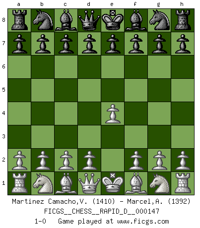 Last move : 1-0 2023 February 1 20:6:30 [Event "FICGS__CHESS__RAPID_D__000147"] [Site "FICGS"] [Date "2022.12.29"] [Round "1"] [White "Martinez Camacho,Victor Hugo"] [Black "Marcel,Alexis"] [Result "1-0"] [WhiteElo "1410"] [BlackElo "1392"] 1.e4 1-0 This chess game has been lost on time (started : 2022.12.29 5:31:53) Follow this game move after move (download)We don't really know how the game was invented, though there are suspicions. As soon as we discover the culprits, we'll let you know. (Bruce Pandolfini) Rauchen ist dem Schachspieler bei seiner Arbeit, also im Wettkampf, untersagt. (Viktor Kortschnoi) Fischer es una tragedia del Ajedrez Americano a la par con Morphy y Pillsbury. (Mig Greengard) Un millionnaire : 'Monsieur Steinitz ! Vous ne participez aux tournois que pour l'argent, alors que moi je n'y viens que pour l'honneur.' Steinitz : 'Chacun joue pour ce qu'il n'a pas'... Perfection is achieved, not when there is nothing more to add, but when there is nothing left to take away. (Antoine de Saint-Exupéry)