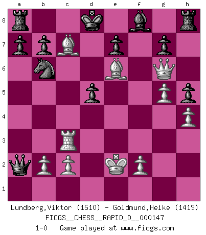 Last move : 1-0 2023 March 3 17:46:44 [Event "FICGS__CHESS__RAPID_D__000147"] [Site "FICGS"] [Date "2022.12.29"] [Round "1"] [White "Lundberg,Viktor"] [Black "Goldmund,Heike"] [Result "1-0"] [WhiteElo "1510"] [BlackElo "1419"] 1.e4 d5 2.exd5 Qxd5 3.Nc3 Qa5 4.d4 Nf6 5.Nf3 Bg4 6.h3 Bh5 7.g4 Bg6 8.Ne5 c6 9.h4 h5 10.Nxg6 fxg6 11.g5 Nd5 12.Qd3 Nd7 13.Qxg6+ Kd8 14.Bd2 Nxc3 15.Bxc3 Qd5 16.Rg1 Kc7 17.Bh3 Nb6 18.Be6 Qf3 19.d5 cxd5 20.Be5+ Kd8 21.Rg3 Qh1+ 22.Ke2 Qxa1 23.Rc3 Qxa2 24.Bc7+ 1-0 Follow this game move after move (download)When asked, -How is that you pick better moves than your opponents?, I responded: I'm very glad you asked me that, because, as it happens, there is a very simple answer. I think up my own moves, and I make my opponent think up his. (Alexander Alekhine) Es ist schade, dass viele Schachsportler vergessen, wie wichtig Auftreten und angemessene Kleidung sind. (Alexandra Kosteniuk) El sobresalir en el Ajedrez es un signo de una mente intrigante. (Sir Arthur Conan Doyle) A ce moment-là, je menaçais de comprendre la position ! (Clément L'Heureux) Now you put water in a cup, it becomes the cup; You put water into a bottle it becomes the bottle; You put it in a teapot it becomes the teapot. Water can flow or it can crash. Be water, my friend. (Bruce Lee)