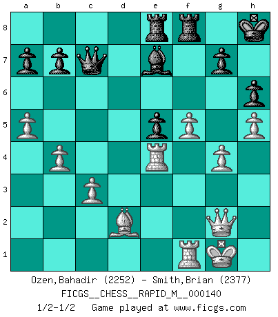Last move : 1/2-1/2 2023 February 19 5:20:6 [Event "FICGS__CHESS__RAPID_M__000140"] [Site "FICGS"] [Date "2022.12.29"] [Round "1"] [White "Ozen,Bahadir"] [Black "Smith,Brian"] [Result "1/2-1/2"] [WhiteElo "2252"] [BlackElo "2377"] 1.e4 d5 2.exd5 Nf6 3.d4 Qxd5 4.Nc3 Qa5 5.Nf3 Bf5 6.Ne5 c6 7.Bc4 e6 8.g4 Bg6 9.h4 Nbd7 10.Nxd7 Nxd7 11.h5 Be4 12.O-O Bd5 13.Nxd5 cxd5 14.Bd3 Bd6 15.a4 O-O 16.f4 Nf6 17.Qe2 Qb6 18.c3 Ne4 19.Bxe4 dxe4 20.Qxe4 h6 21.b4 Rae8 22.Qg2 Qc7 23.Bd2 f6 24.Rae1 Kh8 25.a5 e5 26.dxe5 fxe5 27.f5 Be7 28.Re4 1/2-1/2 Follow this game move after move (download)The essence of Chess is thinking about what Chess is. (David Bronstein) Schach ist ein Kampf gegen den Fehler. (Johannes Herrman Zukertort) Un juego de Ajedrez es un dialogo, una conversación entre un jugador y su oponente. Cada movimiento del oponente puede contener amenazas o tropiezos, pero un jugador no se puede defender de las amenazas o tomar ventaja de los tropiezos si es que no se pregunta a sí mismo: ¿Que es lo que mi oponente va a hacer después de cada movida?. (Bruce A. Moon) Les réformistes prétendent que les progrès de la théorie conduiront à la disparition des échecs, et qu'il faut, pour leur rendre vie, en remanier les règles. En réalité, qu'exprime cette affirmation? Le mépris de l'intuition, de l'imagination et de tous les autres éléments qui font des échecs un art. (Alexander Alekhine) Patience, use the Force, think ! (Obi-Wan Kenobi in Star Wars ep.2)