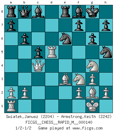 Last move : 1/2-1/2 2023 February 16 4:49:14 [Event "FICGS__CHESS__RAPID_M__000140"] [Site "FICGS"] [Date "2022.12.29"] [Round "1"] [White "Swiatek,Janusz"] [Black "Armstrong,Keith"] [Result "1/2-1/2"] [WhiteElo "2204"] [BlackElo "2242"] 1.d4 Nf6 2.c4 e6 3.Nf3 b6 4.g3 Ba6 5.Qc2 c5 6.d5 exd5 7.cxd5 Bb7 8.Bg2 Nxd5 9.O-O Be7 10.Rd1 Nc6 11.Qf5 Nf6 12.e4 g6 13.Qf4 O-O 14.e5 Nh5 15.Qg4 d5 16.exd6 Bxd6 17.Nc3 Qb8 18.Bh6 Re8 19.Nd5 Ne7 20.Ne3 Nc6 21.Qc4 Nd8 22.Ng4 Ne6 23.Be3 Bf8 24.Rd7 Bc8 25.Rd5 1/2-1/2 Follow this game move after move (download)Chess problems demand from the composer the same virtues that characterize all worthwhile art: originality, invention, conciseness, harmony, complexity, and splendid insincerity. (Vladimir Nabokov) Zu meiner Zeit war ein 20 jähriger ein junger Spieler, heute ist er ein Veteran. (Garry Kasparov) El Ajedrez es un juego de pelea el cual es puramente intelectual e incluye la suerte. (Richard Reti) Votre seul travail dans les ouvertures est d'obtenir un milieu de partie jouable. (Lajos Portish) A good aphorism is too hard for the tooth of time, and is not worn away with the centuries, although it serves as food for every speech. (Friedrich Nietzsche)