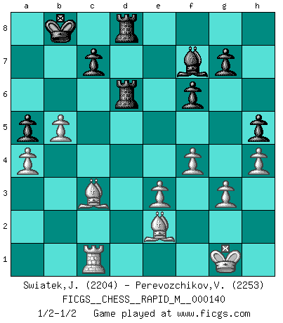 Last move : 1/2-1/2 2023 February 13 8:47:53 [Event "FICGS__CHESS__RAPID_M__000140"] [Site "FICGS"] [Date "2022.12.29"] [Round "1"] [White "Swiatek,Janusz"] [Black "Perevozchikov,Vjacheslav"] [Result "1/2-1/2"] [WhiteElo "2204"] [BlackElo "2253"] 1.d4 d5 2.c4 e5 3.dxe5 d4 4.Nf3 Nc6 5.a3 Nge7 6.b4 Ng6 7.Bb2 a5 8.b5 Ncxe5 9.Qxd4 Qxd4 10.Bxd4 Nxc4 11.e3 Nd6 12.Be2 b6 13.O-O Bd7 14.a4 O-O-O 15.Nbd2 f6 16.Rfc1 Kb8 17.Rd1 Nb7 18.Bc3 Bc5 19.Nb3 Ne7 20.Rdc1 Bd6 21.h4 h5 22.Nbd4 Nc5 23.Bb2 Nf5 24.Rc4 Nxd4 25.Nxd4 Be5 26.Re1 Be8 27.g3 Kc8 28.Rec1 Bf7 29.Rxc5 bxc5 30.Rxc5 Rd6 31.Rc1 Rhd8 32.f4 Bxd4 33.Bxd4 Kb8 34.Bc3 1/2-1/2 Follow this game move after move (download)If a ruler does not understand Chess, how can he rule over a kingdom ? (King Khusros II) Die Idee von Capablanca, Schach als Fach in den Schulen zu lehren, ist großartig. (Fidel Castro) Debemos de asegurarnos de que el Ajedrez no se convierta en un lenguaje muerto, muy interesante, pero solo para un grupo muy pequeño. (Sytze Faber) Ce qui est bien, c'est d'avoir tout un tas de pièces en prise : l'adversaire ne peut en prendre qu'une à la fois. Cité par Thierry Audin. I know the human being and fish can coexist peacefully. (George W. Bush, Saginaw sept. 29, 2000)