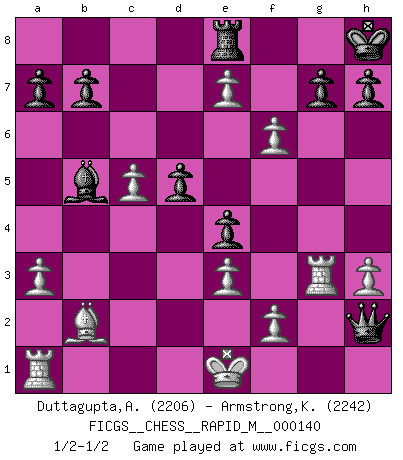 Last move : 1/2-1/2 2023 March 14 22:31:42 [Event "FICGS__CHESS__RAPID_M__000140"] [Site "FICGS"] [Date "2022.12.29"] [Round "1"] [White "Duttagupta,Aniruddha"] [Black "Armstrong,Keith"] [Result "1/2-1/2"] [WhiteElo "2206"] [BlackElo "2242"] 1.c4 e5 2.Nc3 Nf6 3.Nf3 Nc6 4.e3 Bb4 5.Qc2 Bxc3 6.Qxc3 Qe7 7.a3 d5 8.d4 e4 9.Ne5 Nxe5 10.dxe5 Ng4 11.cxd5 O-O 12.b4 Qh4 13.g3 Qh5 14.Be2 Qf5 15.Bxg4 Qxg4 16.Bb2 c6 17.h3 Qf3 18.Rg1 cxd5 19.e6 f6 20.e7 Re8 21.g4 Bd7 22.Qc5 Kh8 23.Rg3 Qh1+ 24.Ke2 Qh2 25.g5 Rac8 26.gxf6 Rxc5 27.bxc5 Bb5+ 28.Ke1 Qh1+ 29.Kd2 Qh2 30.Ke1 1/2-1/2 Follow this game move after move (download)When you absolutely don't know what to do anymore, it is time to panic. (John van der Wiel) Der Vorposten provoziert a) eine Basis für neue Angriffe und b) eine Schwächung der gegnerischen Widerstandskraft in der fraglichen Linie. (Aaron Nimzowitsch) Yo jugué Ajedrez con el y a veces le pude haber ganado solo que siempre devuelve su última jugada y juega la partida de manera diferente. (Mark Twain) Il n'y a plus de joueurs du niveau de Jacob Murray dont la seule quête est le beau jeu, le plaisir de voir les pièces construire quelque chose. Sur 10 idées à la minute, 9 seront sans intérêt, la dernière s'avèrera géniale. (Christian Bauer) He who defends everything defends nothing. (Frederick the Great)