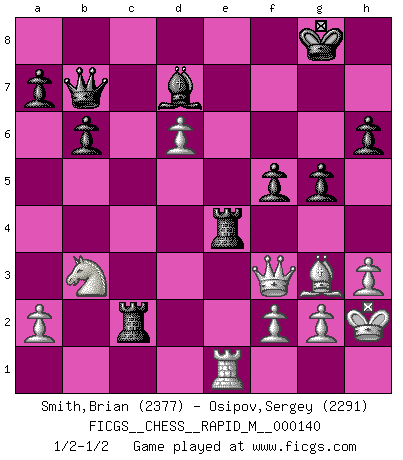 Last move : 1/2-1/2 2023 February 19 0:31:19 [Event "FICGS__CHESS__RAPID_M__000140"] [Site "FICGS"] [Date "2022.12.29"] [Round "1"] [White "Smith,Brian"] [Black "Osipov,Sergey"] [Result "1/2-1/2"] [WhiteElo "2377"] [BlackElo "2291"] 1.Nf3 Nf6 2.c4 e6 3.Nc3 d5 4.cxd5 exd5 5.d4 Bb4 6.Bg5 O-O 7.e3 h6 8.Bh4 Bf5 9.Qb3 Bxc3+ 10.bxc3 Nbd7 11.Be2 c5 12.dxc5 Nxc5 13.Qb4 Rc8 14.O-O g5 15.Bg3 Re8 16.Rfd1 Nfe4 17.c4 Qf6 18.cxd5 Nc3 19.Nd4 Nxd1 20.Rxd1 Ne4 21.d6 Nc3 22.Re1 Nxe2+ 23.Nxe2 b6 24.Qa4 Qe6 25.h3 Qd7 26.Qa3 Qb7 27.Nd4 Bd7 28.Kh2 Rc5 29.e4 Rxe4 30.Qf3 f5 31.Nb3 Rc2 1/2-1/2 Follow this game move after move (download)I'd rather have a Pawn than a finger. (Reuben Fine) Nie in meinem Leben habe ich die französische Verteidigung gespielt, welche die Stumpfsinnigste von allen ist. (Wilhelm Steinitz) No solamente yo pronostico su triunfo sobre Botvinnik, sino que me adelanto y digo que probablemente Fischer es el jugador de Ajedrez mas grande que haya existido. (John Collins) Le jeu d'échecs fait naître et fortifie en nous plusieurs qualités précieuses dans le cours de l'existence, telles que la prévoyance, la circonspection, la prudence, et la persévérance. (Benjamin Franklin - 1783, la morale des échecs) The ultimate in disposing one's troops is to be without ascertainable shape. Then the most penetrating spies cannot pry in nor can the wise lay plans against you. (Sun Tzu)
