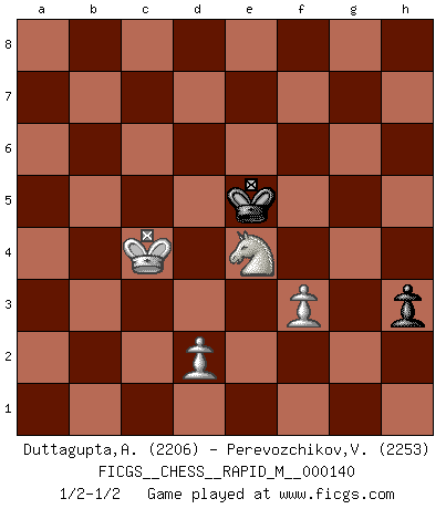 Last move : 1/2-1/2 2023 February 28 8:42:6 [Event "FICGS__CHESS__RAPID_M__000140"] [Site "FICGS"] [Date "2022.12.29"] [Round "1"] [White "Duttagupta,Aniruddha"] [Black "Perevozchikov,Vjacheslav"] [Result "1/2-1/2"] [WhiteElo "2206"] [BlackElo "2253"] 1.c4 e5 2.Nc3 Nf6 3.Nf3 Nc6 4.e3 Bb4 5.Qc2 Bxc3 6.Qxc3 Qe7 7.a3 a5 8.b3 d5 9.cxd5 Nxd5 10.Qc2 e4 11.Ng1 O-O 12.Ne2 Ndb4 13.axb4 Nxb4 14.Qc3 Nd3+ 15.Kd1 Nxf2+ 16.Kc2 Nxh1 17.Ba3 Qd8 18.Bxf8 Kxf8 19.Nd4 Nf2 20.Rxa5 Rxa5 21.Qxa5 Ng4 22.Nb5 Nxh2 23.Nxc7 Kg8 24.Bc4 Ng4 25.b4 Bd7 26.Kc3 h5 27.Nd5 Qxa5 28.bxa5 Ne5 29.Nb4 Nxc4 30.Kxc4 g5 31.Kc5 h4 32.Kb6 f5 33.Kxb7 Bb5 34.Nd5 Kf7 35.Kb6 Bf1 36.a6 Bxa6 37.Kxa6 Ke6 38.Nc3 Ke5 39.Kb5 f4 40.exf4+ gxf4 41.Kc4 f3 42.gxf3 h3 43.Nxe4 1/2-1/2 Follow this game move after move (download)All Chess players should have a hobby. (Savielly Tartakower) Schach ist Leben. (Robert James Fischer) Es muy difícil jugar en contra de la teoría de Einstein. - en su primera derrota en contra de Fischer (Mikhail Tal) Mais n'est-ce pas déjà le limiter injurieusement que d'appeler les échecs un jeu? N'est-ce pas aussi une science, un art, ou quelque chose qui, comme le cercueil de Mahomet entre ciel et terre, est suspendu entre l'un et l'autre, et qui réunit un nombre incroyable de contraires ? (Stefan Zweig) Optimism is a variety of information deficit. Sometimes especially true for correspondence chess games. (Michael Aigner)