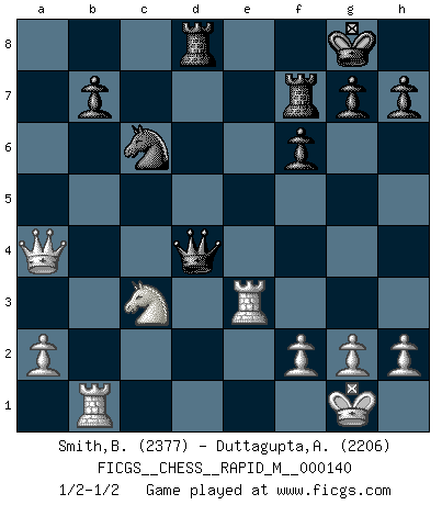Last move : 1/2-1/2 2023 February 19 5:47:58 [Event "FICGS__CHESS__RAPID_M__000140"] [Site "FICGS"] [Date "2022.12.29"] [Round "1"] [White "Smith,Brian"] [Black "Duttagupta,Aniruddha"] [Result "1/2-1/2"] [WhiteElo "2377"] [BlackElo "2206"] 1.Nf3 d5 2.c4 d4 3.b4 f6 4.e3 e5 5.c5 a5 6.Qa4+ Bd7 7.b5 Bxc5 8.Bc4 Ne7 9.exd4 exd4 10.Ba3 Bxa3 11.Qxa3 c6 12.Nxd4 cxb5 13.Nxb5 Bxb5 14.Bxb5+ Nbc6 15.O-O O-O 16.Nc3 Nd4 17.Rfe1 Nec6 18.Bxc6 Nxc6 19.Rad1 Nd4 20.Qa4 Qd6 21.Rb1 Rf7 22.Re4 Rd8 23.Qxa5 Nc6 24.Qa4 Qxd2 25.Re3 Qd4 1/2-1/2 Follow this game move after move (download)There must have been a time when men were demigods, or they could not have invented Chess. (Gustav Schenk) Es genügt nicht ein guter Spieler zu sein, man muß auch gut spielen. (Siegbert Tarrasch) Un buen sacrificio es aquel que aunque no sea necesariamente sólido, deja a tu oponente aturdido y confuso. (Rudolph Spielmann) Même si vous avez un bon coup à faire, regardez toujours s'il n'y en a pas un qui lui soit préférable. (Pedro Damiano) All the biggest technological inventions created by man - the airplane, the automobile, the computer - says little about his intelligence, but speaks volumes about his laziness. (Mark Kennedy)