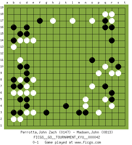 Last move : 0-1 2007 November 6 18:47:9 [Event "FICGS__GO__TOURNAMENT_KYU__000042"] [Site "FICGS"] [Date "2007.08.21"] [Round "1"] [Black "Perrotta,John Zach"] [White "Madsen,John"] [Result "0-1"] [Rating 1 "0147"] [Rating 2 "0813"] 1.q16 d3 2.d16 r4 3.f17 o17 4.r14 l17 5.d10 c14 6.c15 d14 7.d15 e14 8.q7 r9 9.c5 d7 10.c7 c8 11.c3 c2 12.b3 b2 13.d4 e3 14.k4 c6 15.b7 b6 16.b8 d6 17.d5 e6 18.d8 e8 19.d9 p3 20.n3 n4 21.m3 n5 22.r11 h17 23.r5 q5 24.r6 p9 25.o11 q10 26.g3 o7 27.b14 b13 28.b16 c11 29.c10 r17 30.q17 q18 31.r16 r18 32.s10 s9 0-1 This go game has been lost on time (started : 2007.08.21 1:41:46) Here are the names of the openings (joseki) played in the four corners : Corner q16 : q16 o17 Hoshi (Hwajeom, Seongjeom, Xingwei`) 4-4 Point. The star or hoshi (4-4) point, emphasizing influence at the potential expense of territory. Ikken Kakari (Hankan Keolch'im, Yi Gua`jiao~, 1-Space Low Approach). White 2 is the standard approach move to the 4-4. Corner q4 : r4 q7 Komoku (Somok, Xiao~mu`) 3-4 Point. The komoku (3-4) point is the traditional corner enclosure move.. Corner d4 : d3 c5 Komoku (Somok, Xiao~mu`) 3-4 Point. The komoku (3-4) point is the traditional corner enclosure move.. Ikken Kakari (Hankan Keolch'im, Yi Gua`jiao~, 1-Space Low Pincer). The small knight move is the basic approach move to the 3-4 point stone. It has been continually used for over four centuries. There are limitless variations, with new moves constantly being discovered. Black 2 opens the door to a treaure store of joseki. Player White won this Go (weiqi, baduk) game. Follow this game move after move (download)... {it is} something unearthly... if there are sentient beings on other planets, then they play go. (Emanuel Lasker, chess world champion) Luck never made a man wise. (Seneca, Letters to Lucilius)