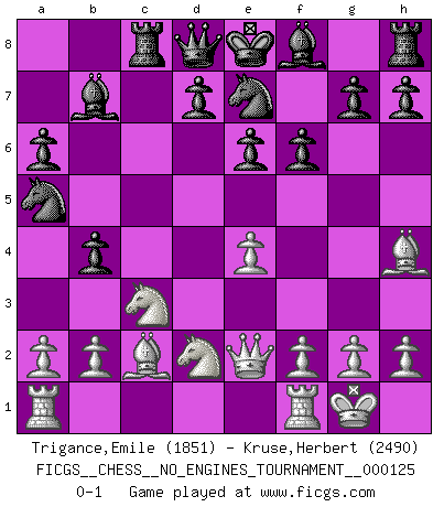 Last move : 0-1 2023 April 20 18:45:28 [Event "FICGS__CHESS__NO_ENGINES_TOURNAMENT__000125"] [Site "FICGS"] [Date "2022.12.31"] [Round "1"] [White "Trigance,Emile"] [Black "Kruse,Herbert"] [Result "0-1"] [WhiteElo "1851"] [BlackElo "2490"] 1.e4 c5 2.d4 cxd4 3.c3 dxc3 4.Nxc3 Nc6 5.Nf3 e6 6.Bc4 a6 7.O-O b5 8.Bb3 Na5 9.Bc2 Bb7 10.Qe2 Rc8 11.Bg5 f6 12.Bh4 Ne7 13.Nd2 b4 0-1 Follow this game move after move (download)I have always a slight feeling of pity for the man who has no knowledge of Chess. (Siegbert Tarrasch) Dass jemand wie Surab Asmaiparaschwili, der selbst Elopunkte gekauft hat , Vize-Präsident der Fide werden konnte, sagt schon einges über den Zustand dieser Organisation aus. (Joel Lautier) Cuando la partida de Ajedrez termina, el Peón y el Rey regresan a la misma caja. (Irish saying) L'ordinateur a tué l'originalité. Il n'y a plus guère d'aventures sur l'échiquier. (Jacob Murray) Philosophers use a language that is already deformed as though by shoes that are too tight. (Ludwig Wittgenstein)