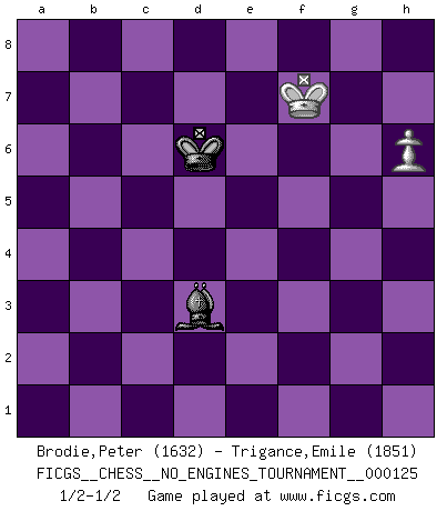 Last move : 1/2-1/2 2023 February 25 16:22:51 [Event "FICGS__CHESS__NO_ENGINES_TOURNAMENT__000125"] [Site "FICGS"] [Date "2022.12.31"] [Round "1"] [White "Brodie,Peter"] [Black "Trigance,Emile"] [Result "1/2-1/2"] [WhiteElo "1632"] [BlackElo "1851"] 1.Nf3 c5 2.d4 cxd4 3.Nxd4 d5 4.e3 g6 5.Nc3 a6 6.Qf3 Nf6 7.h3 Bg7 8.Bd3 e5 9.Nb3 e4 10.Nxe4 dxe4 11.Bxe4 Nxe4 12.Qxe4+ Qe7 13.Qxe7+ Kxe7 14.O-O Rd8 15.c3 Nc6 16.e4 Kf8 17.Be3 Be6 18.Nd4 Nxd4 19.cxd4 Bxd4 20.Bxd4 Rxd4 21.f3 Rad8 22.b3 Rd2 23.Rf2 a5 24.Raf1 b5 25.Rxd2 Rxd2 26.Rf2 Rxf2 27.Kxf2 Ke7 28.Ke3 Kd6 29.Kd4 a4 30.e5+ Kc6 31.bxa4 Bxa2 32.axb5+ Kxb5 33.g4 Bc4 34.f4 Be6 35.Ke4 Bc4 36.f5 Bf1 37.fxg6 hxg6 38.h4 Kc5 39.h5 gxh5 40.gxh5 Kc4 41.Kf5 Kd5 42.Kf6 Bd3 43.Kxf7 Kxe5 44.h6 Kd6 1/2-1/2 Follow this game move after move (download)A man without frontiers. He didn't divide the East and the West, he brought them together in their admiration for him. (Ljubomir Ljubojevic, about Bobby Fischer's death) Karpov ist ein Museumsstück. (Garry Kasparov) EL Ajedrez es como la vida. (Boris Spassky) On entre au jeu d'Echecs comme on entre en Religion. Pour le joueur d'Echecs, la partie d'Echecs c'est l'office, la messe, le défilé du 1er Mai, le dépôt de gerbe au Monument aux Morts. C'est un drame sacré. (Michel Roos) Memory is a way of holding onto the things you love, the things you are, the things you never want to lose. (from the television show: The Wonder Years)