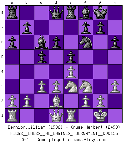 Last move : 0-1 2023 June 4 12:20:51 [Event "FICGS__CHESS__NO_ENGINES_TOURNAMENT__000125"] [Site "FICGS"] [Date "2022.12.31"] [Round "1"] [White "Bennion,William"] [Black "Kruse,Herbert"] [Result "0-1"] [WhiteElo "1936"] [BlackElo "2490"] 1.e4 c5 2.Na3 d6 3.Bb5+ Nd7 4.Nf3 a6 5.Bxd7+ Bxd7 6.c3 Bc6 7.d3 Nf6 8.O-O e5 9.Re1 Be7 10.Bg5 h6 11.Be3 Ng4 12.Bd2 O-O 13.h3 Nf6 14.Nc2 Re8 15.Ne3 Bf8 0-1 Follow this game move after move (download)I have added these principles to the law: get the Knights into action before both Bishops are developed. (Emanuel Lasker) Im Schach gewinnt jeder. Hat man Freunde am Spiel - und das ist die Hauptsache - ist auch der Verlust einer Partie kein Unglück. (David Bronstein) Existen dos clases de sacrificios: los correctos y los míos. (Mikhail Tal) Toutes choses étant égales, c'est la conviction qui gagne. Alliée à une volonté de vaincre, elle sert de détonateur, suscite des idées, disperse les doutes et aide à penser clairement. (Robert Fischer) Information on the Internet is subject to the same rules and regulations as conversation at a bar. (George Lundberg)