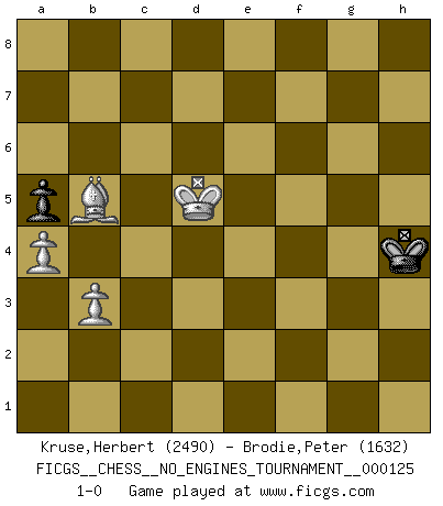 Last move : 1-0 2023 November 7 16:57:17 [Event "FICGS__CHESS__NO_ENGINES_TOURNAMENT__000125"] [Site "FICGS"] [Date "2022.12.31"] [Round "1"] [White "Kruse,Herbert"] [Black "Brodie,Peter"] [Result "1-0"] [WhiteElo "2490"] [BlackElo "1632"] 1.e4 e5 2.Nf3 Nc6 3.Bb5 Nd4 4.Nxd4 exd4 5.O-O c6 6.Bc4 d5 7.exd5 cxd5 8.Bb5+ Bd7 9.Re1+ Be7 10.Qg4 Kf8 11.Qxd7 a6 12.Qxd8+ Rxd8 13.Bf1 g6 14.b3 Kg7 15.Bb2 Bf6 16.d3 Ne7 17.Nd2 Rc8 18.Rac1 Nc6 19.a3 h5 20.g3 Bg5 21.f4 Bf6 22.Bh3 Rce8 23.Bg2 Rd8 24.Re2 h4 25.Rce1 g5 26.fxg5 Bxg5 27.Nf3 Bf6 28.Nxh4 Bxh4 29.gxh4 Rxh4 30.Re3 Kf8 31.Rh3 Rxh3 32.Bxh3 a5 33.Bg2 b5 34.Rf1 Kg7 35.Rf4 f6 36.Bxd4 Rd6 37.Bxf6+ Rxf6 38.Rxf6 Kxf6 39.Bxd5 Nd4 40.c4 Ke5 41.Bf7 bxc4 42.Bxc4 Nc2 43.a4 Nd4 44.Kf2 Kf4 45.h3 Nc6 46.Ke2 Kg3 47.Ke3 Kxh3 48.d4 Kg4 49.Ke4 Nb4 50.d5 Kg5 51.Ke5 Kh4 52.Bb5 Nxd5 53.Kxd5 1-0 Follow this game move after move (download)I had a toothache during the first game. In the second game I had a headache. In the third game it was an attack of rheumatism. In the fourth game, I wasn't feeling well. And in the fifth game? Well, must one have to win every game ? (Siegbert Tarrasch) Du weisst es gibt ein Problem mit Computern und Fernschach, wenn jeder eine Rating von 2450 hat. (John Christen Knudsen) Bobby solo arroja las piezas y solas caen en las casillas correctas. (Miguel Najdorf ) Il n'y a plus de joueurs du niveau de Jacob Murray dont la seule quête est le beau jeu, le plaisir de voir les pièces construire quelque chose. Sur 10 idées à la minute, 9 seront sans intérêt, la dernière s'avèrera géniale. (Christian Bauer) Luck is the residue of design. (John Milton)