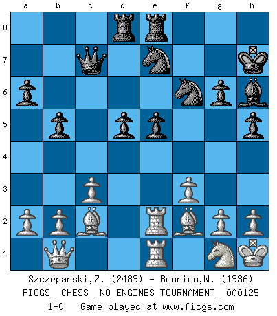 Last move : 1-0 2023 April 30 13:54:38 [Event "FICGS__CHESS__NO_ENGINES_TOURNAMENT__000125"] [Site "FICGS"] [Date "2022.12.31"] [Round "1"] [White "Szczepanski,Zbigniew"] [Black "Bennion,William"] [Result "1-0"] [WhiteElo "2489"] [BlackElo "1936"] 1.e4 c5 2.Nc3 g6 3.Nge2 Bg7 4.d4 cxd4 5.Nxd4 Nc6 6.Be3 Nf6 7.Bc4 O-O 8.Bb3 Re8 9.f3 d5 10.exd5 Nb4 11.Nde2 e6 12.Bd4 exd5 13.O-O h5 14.Re1 Be6 15.Nf4 Nc6 16.Bf2 Na5 17.Ba4 Nc6 18.Nxe6 fxe6 19.Ne2 e5 20.c3 Qd6 21.Qc2 Kh7 22.Rad1 Rad8 23.Kh1 a6 24.Qb1 b5 25.Bc2 Ne7 26.Ng1 Bh6 27.Re2 Qc7 28.Rde1 1-0 Follow this game move after move (download)A man that will take back a move at Chess will pick a pocket. (Richard Fenton) Wenn ich Weiß habe gewinne ich weil ich Weiß habe, wenn ich Schwarz habe gewinne ich weil ich Bogoljubov bin. (Efim Bogoljubov) Fischer es el jugador mas fuerte del mundo. De hecho, el jugador mas fuerte que jamas haya existido. (Larry Evans) Echiquier : carré parfait, comme la Jérusalem nouvelle décrite par l'auteur de l'Apocalypse, huit cases sur huit, exaltation du chiffre 4, symbole du cosmos aux quatre horizons... où le noir et le blanc, l'ombre et la lumière, le mal et le bien s'entremêlent et se conjuguent. (Robert Couffignal, Le Gambit du poète) 'preceded by its own quotation yields a falsehood' preceded by its own quotation yields a falsehood. (W. V. O. Quine - Set Theory And Its Logic, 1953)