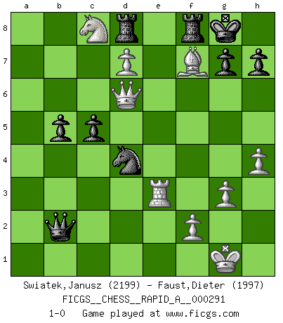 Last move : 1-0 2023 February 17 9:11:6 [Event "FICGS__CHESS__RAPID_A__000291"] [Site "FICGS"] [Date "2023.01.09"] [Round "1"] [White "Swiatek,Janusz"] [Black "Faust,Dieter"] [Result "1-0"] [WhiteElo "2199"] [BlackElo "1997"] 1.d4 Nf6 2.c4 e6 3.g3 c5 4.d5 exd5 5.cxd5 b5 6.Nf3 Bb7 7.e4 Nxe4 8.Bg2 Nd6 9.O-O Be7 10.Bf4 O-O 11.Re1 Na6 12.Nc3 Nc7 13.Ne5 Rc8 14.a4 a6 15.axb5 Ncxb5 16.Nxb5 axb5 17.Ra7 Bg5 18.Rxb7 Nxb7 19.Bxg5 Qxg5 20.d6 Na5 21.Nxd7 Rfe8 22.Nb6 Rcd8 23.d7 Rf8 24.Qd6 Nb3 25.Bd5 Nd4 26.h4 Qd2 27.Re3 Qc2 28.Nc8 Qxb2 29.Bxf7+ 1-0 Follow this game move after move (download)Modern Chess is too much concerned with things like Pawn structure. Forget it, Checkmate ends the game. (Nigel Short) Glücklicherweise sind Großmeister Ruben Fines reine Schachbücher weniger phallozentrisch [als seine Schachpsychologie] und deswegen auch weniger lächerlich. (Nigel Short) ¿Que sería del Ajedrez sin errores graciosos?. (Kurt Richter) Donnez-moi un Cavalier en 6e et je gagnerais toutes mes parties. (Steinitz) Before all elsed, be armed. (Niccolo Machiavelli)