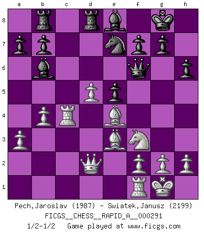 Last move : 1/2-1/2 2023 April 23 0:30:13 [Event "FICGS__CHESS__RAPID_A__000291"] [Site "FICGS"] [Date "2023.01.09"] [Round "1"] [White "Pech,Jaroslav"] [Black "Swiatek,Janusz"] [Result "1/2-1/2"] [WhiteElo "1987"] [BlackElo "2199"] 1.d4 d5 2.c4 e6 3.Nc3 Bb4 4.e3 Nf6 5.Nf3 O-O 6.Bd3 dxc4 7.Bxc4 c5 8.O-O Nc6 9.a3 Ba5 10.Bd3 h6 11.Bc2 Qe7 12.Ne4 Nxe4 13.Bxe4 cxd4 14.exd4 Rd8 15.Be3 Bb6 16.Rc1 Qf6 17.Qc2 Bd7 18.b4 Rab8 19.Qd2 Be8 20.Rc4 e5 21.d5 Ne7 1/2-1/2 Follow this game move after move (download)Bobby Fischer is the greatest Chess player who has ever lived. (Ken Smith) Unter Putin wird alles Geld aus Russland wie von einem Staubsauger nach Moskau umgeleitet, das ist wie ein schwarzes Loch. (Garry Kasparov) El Peón aislado arroja penumbra sobre todo el tablero. (Aaron Nimzovich) Lorsque vous vous retrouvez devant une position atroce, ne tendez pas un ultime piège dérisoire avec l'intention d'abandonner si l'adversaire le déjoue ! Faites-vous plutôt un devoir de résister comme si votre vie en dépendait. Jouez le coup qui vous déplairait au centuple si vous étiez dans la peau de votre tortionnaire ! There are two kinds of people in the world, my friend. Those who have a loaded gun and those who dig. You dig ! (Blondie in The Good, The Bad and The Ugly)