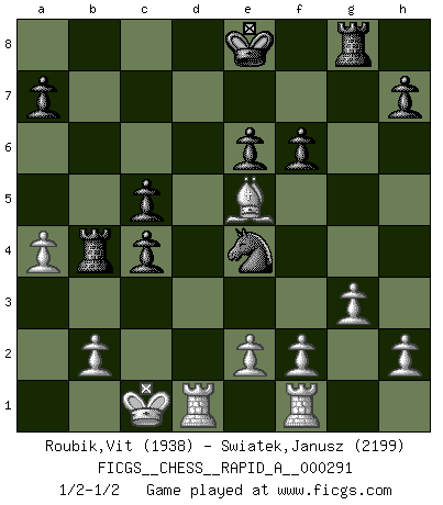 Last move : 1/2-1/2 2023 February 26 21:9:0 [Event "FICGS__CHESS__RAPID_A__000291"] [Site "FICGS"] [Date "2023.01.09"] [Round "1"] [White "Roubik,Vit"] [Black "Swiatek,Janusz"] [Result "1/2-1/2"] [WhiteElo "1938"] [BlackElo "2199"] 1.d4 d5 2.c4 e6 3.g3 dxc4 4.Nf3 c5 5.Bg2 Nc6 6.Qa4 cxd4 7.Nxd4 Qxd4 8.Bxc6+ Bd7 9.Be3 Bxc6 10.Qxc6+ bxc6 11.Bxd4 Bb4+ 12.Nc3 Nf6 13.a3 Bxc3+ 14.Bxc3 Rb8 15.O-O-O Ne4 16.Bxg7 Rg8 17.Bd4 c5 18.Be5 Rb5 19.a4 Rb4 20.Rhf1 f6 1/2-1/2 Follow this game move after move (download)Becoming successful at Chess allows you to discover your own personality. That's what I want for the kids I teach. (Saudin Robovic) Kleine Schachspieler machen Mist, und große Schachspieler machen Mist, aber große machen weniger Mist. (Fritz Sämisch) Nada excita más a Grandes Maestros aburridos que una novedad teórica. (Dominic Lawson) Dans le domaine de la peinture, de la gravure et de la sculpture, dès la première décennie de notre siècle, les artistes abandonnent la représentation de la partie d'échecs pour se concentrer sur les pièces, sur les échiquiers et sur toutes les variations auxquelles les unes et les autres peuvent donner lieu. On passe en quelque sorte d'un thème social à un thème musical (au sens de la musica médiévale, c'est-à-dire d'une notion qui inclue le rythme, l'harmonie, la construction et la déconstruction, etc.). Graphiquement et picturalement, l'échiquier apparaît comme une structure ouverte, dynamique, d'une richesse infinie, autorisant toutes les combinatoires et débouchant sur des mouvements et des rythmes de nature exponentielle. (Michel Pastoureau) There are two major products that came out of Berkeley: LSD and UNIX. We do not believe this is to be a coincidence. (Jeremy S. Anderson)