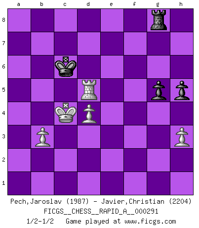 Last move : 1/2-1/2 2023 September 4 15:18:52 [Event "FICGS__CHESS__RAPID_A__000291"] [Site "FICGS"] [Date "2023.01.09"] [Round "1"] [White "Pech,Jaroslav"] [Black "Javier,Christian"] [Result "1/2-1/2"] [WhiteElo "1987"] [BlackElo "2204"] 1.e4 c5 2.c3 Nf6 3.e5 Nd5 4.d4 cxd4 5.Nf3 d6 6.cxd4 Nc6 7.Bc4 Nb6 8.Bb5 dxe5 9.Nxe5 Bd7 10.Nxd7 Qxd7 11.Nc3 e6 12.O-O a6 13.Bxc6 Qxc6 14.Be3 Nd5 15.Rc1 Be7 16.Qf3 Nxc3 17.Qxc6+ bxc6 18.Rxc3 Kd7 19.Rfc1 Rhc8 20.b3 a5 21.Rc4 Ra6 22.Kf1 Rb8 23.Bd2 Rb5 24.Ke2 Rh5 25.h3 Rb6 26.R1c2 Rf5 27.g4 Rd5 28.Bc1 h6 29.Kf3 Bd6 30.Bf4 Rdb5 31.Bd2 Rd5 32.Bf4 Rdb5 33.Bc1 Rd5 34.Ke4 Be7 35.Bd2 Bd8 36.Rc5 Ra6 37.Kd3 Bh4 38.Bf4 Bf6 39.R5c4 Rb6 40.Be3 Bg5 41.Rc1 Bf6 42.Ke4 Bd8 43.Kd3 Bf6 44.Bd2 Kd6 45.R1c2 Kd7 46.Ke2 Bd8 47.Kd3 Bh4 48.Bf4 Bf6 49.Bc1 Be7 50.Be3 Bd6 51.Ke4 Be7 52.Bc1 Ra6 53.Bf4 f5+ 54.Kd3 Bf6 55.Be3 e5 56.Rc5 e4+ 57.Ke2 Be7 58.Rxd5+ cxd5 59.gxf5 a4 60.f3 axb3 61.axb3 Rf6 62.fxe4 dxe4 63.Bf4 Rxf5 64.Ke3 Bd6 65.Bxd6 Kxd6 66.Kxe4 Rb5 67.Rc3 g5 68.Rg3 Rb8 69.Rc3 Re8+ 70.Kd3 h5 71.Rc5 Rb8 72.Kc4 Rg8 73.Rd5+ Kc7 74.Rc5+ Kd6 75.Rd5+ Kc6 1/2-1/2 Follow this game move after move (download)I prefer to lose a really good game than to win a bad one. (David Levy) Schach ist die gewalttätigste aller Sportarten. (Garry Kasparov) Dejen al perfeccionista jugar por correo. (Yasser Seirawan) Fischer est le meilleur joueur du monde et Karpov n'est qu'un joueur de bistrot. (Garry Kasparov, agé de 16 ans) Crush them ! Make them suffer ! (General Grievous in Star Wars ep.3)