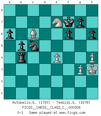 Last move : 0-1 2023 November 15 4:37:55 [Event "FICGS__CHESS__CLASS_C__000308"] [Site "FICGS"] [Date "2023.01.10"] [Round "1"] [White "Autobello,Giovanni"] [Black "Tedoldi,Guido"] [Result "0-1"] [WhiteElo "1720"] [BlackElo "1678"] 1.d4 e6 2.c4 d5 3.Nf3 c5 4.cxd5 exd5 5.Nc3 Nf6 6.Bg5 h6 7.Bxf6 Qxf6 8.g3 Be6 9.dxc5 Bxc5 10.Bg2 O-O 11.O-O Rd8 12.Qc2 Na6 13.a3 Rac8 14.Qa4 d4 15.Nb5 d3 16.exd3 Qxb2 17.Rab1 Bxf2+ 18.Kh1 Qe2 19.Qe4 Qxe4 20.dxe4 Bb6 21.a4 Bc4 22.Ne5 Bxf1 23.Rxf1 f6 24.Ng6 Kf7 25.Nf4 Rc4 26.Ra1 Bd4 27.Nxd4 Rcxd4 28.h4 Rd1+ 29.Rxd1 Rxd1+ 30.Kh2 Rd2 31.Nd5 Nc5 32.Kh3 Nxa4 33.Bf1 a6 34.Bc4 Rd4 35.Ne3 Kg6 36.Bd5 b5 37.Bc6 Nc5 38.Nf5 Rb4 39.Ne7+ Kf7 0-1 This chess game has been lost on time (started : 2023.01.10 17:57:21) Follow this game move after move (download)The tactician knows what to do when there is something to do; whereas the strategian knows what to do when there is nothing to do. (Gerald Abrahams) Es ist im Leben wie im Schachspiel. Wir entwerfen einen Plan, dieser bleibt jedoch bedingt durch das, was im Schachspiel dem Gegner, im Leben dem Schicksal zu tun belieben wird. (Arthur Schopenhauer) Con el tiempo, empecé a progresar en partidas decisivas. Tal vez porque me di cuenta de una simple verdad: no solo estaba yo nervioso sino también mi oponente. (Mikhail Tal) Les Cavaliers se révèlent fort utiles dans les positions fermées. D'habitude, les Fous sont un peu plus forts que les Cavaliers dans les positions ouvertes. Qu'on le veuille ou non, il restera toujours des exceptions ! There's always a bigger fish. (Qui-Gon Jinn in Star Wars ep.1)