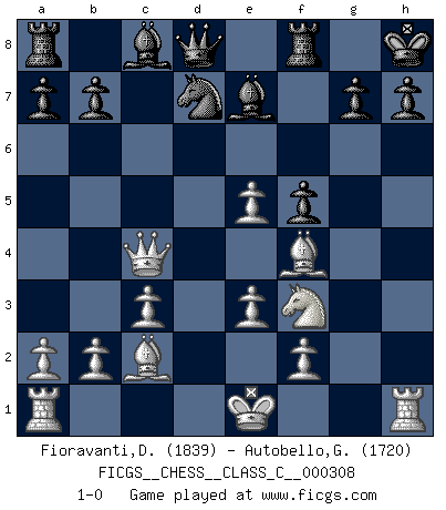 Last move : 1-0 2023 June 2 20:33:45 [Event "FICGS__CHESS__CLASS_C__000308"] [Site "FICGS"] [Date "2023.01.10"] [Round "1"] [White "Fioravanti,Diego"] [Black "Autobello,Giovanni"] [Result "1-0"] [WhiteElo "1839"] [BlackElo "1720"] 1.d4 Nf6 2.Bf4 d5 3.Nf3 e6 4.e3 c5 5.c3 Nc6 6.Nbd2 Be7 7.Bd3 O-O 8.Ne5 Nxe5 9.dxe5 Nd7 10.h4 c4 11.Bc2 f5 12.g4 Bxh4 13.gxf5 exf5 14.Nf3 Be7 15.Qxd5+ Kh8 16.Qxc4 1-0 This chess game has been lost on time (started : 2023.01.10 17:57:21) Follow this game move after move (download)I have always a slight feeling of pity for the man who has no knowledge of Chess. (Siegbert Tarrasch) Ich bin stolz ein Bulgare zu sein. (Veselin Topalov) Todos los Maestros de Ajedrez fueron un día unos principiantes. (Chernev) Un footballeur joue avec ses pieds, parfois avec sa tête. Un joueur d'échecs ne joue qu'avec sa tête. Et quand il ne joue plus, il meurt. (Jacob Murray) Faith : not wanting to know what is true. (Friedrich Nietzsche)