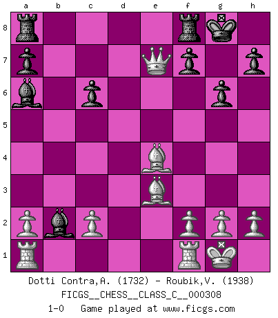 Last move : 1-0 2023 February 3 22:17:42 [Event "FICGS__CHESS__CLASS_C__000308"] [Site "FICGS"] [Date "2023.01.10"] [Round "1"] [White "Dotti Contra,Alessandro"] [Black "Roubik,Vit"] [Result "1-0"] [WhiteElo "1732"] [BlackElo "1938"] 1.e4 c5 2.Nf3 Nc6 3.Nc3 g6 4.d4 cxd4 5.Nxd4 Bg7 6.Be3 Nf6 7.Bc4 O-O 8.O-O Nxe4 9.Nxe4 d5 10.Nxc6 bxc6 11.Bd3 dxe4 12.Bxe4 Ba6 13.Qxd8 Bxb2 14.Qxe7 1-0 Follow this game move after move (download)Life is like a game of Chess, changing with each move. (Chinese proverb) Im Schach gewinnt jeder. Hat man Freunde am Spiel - und das ist die Hauptsache - ist auch der Verlust einer Partie kein Unglück. (David Bronstein) El jugador de combinación piensa hacia adelante; comienza de la posición dada y trabaja las movidas contundentes en su mente. (Emanuel Lasker) Le succès, c'est être capable d'aller d'échec en échec sans perdre son enthousiasme. (Winston Churchill) He is a liar. I just don't know what the lie is yet. (Horatio Caine, C.S.I. Miami)