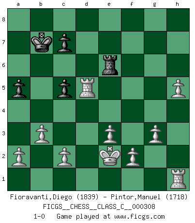 Last move : 1-0 2023 April 29 6:14:1 [Event "FICGS__CHESS__CLASS_C__000308"] [Site "FICGS"] [Date "2023.01.10"] [Round "1"] [White "Fioravanti,Diego"] [Black "Pintor,Manuel"] [Result "1-0"] [WhiteElo "1839"] [BlackElo "1718"] 1.b3 e5 2.Bb2 Nc6 3.e3 Bc5 4.Nf3 d6 5.Bb5 Bg4 6.d4 exd4 7.Bxd4 Bb6 8.Bxg7 Qg5 9.Nxg5 Bxd1 10.Kxd1 O-O-O 11.Bxh8 f6 12.Bxc6 bxc6 13.Nxh7 Nh6 14.Bxf6 Rd7 15.Bg5 Rxh7 16.Bxh6 Rxh6 17.Nd2 Rf6 18.Ke2 d5 19.Nf3 Rg6 20.g3 Re6 21.Rad1 a5 22.h4 Bc5 23.Nd4 Bxd4 24.Rxd4 Kb7 25.h5 c5 26.Rxd5 1-0 Follow this game move after move (download)Chess is a part of culture and if a culture is declining then Chess too will decline. (Mikhail Botvinnik) Wenn Du nicht kämpfst, um anderen etwas zu beweisen, sondern nur für Dich selbst, dann bist du fast unbesiegbar. (Garry Kasparov) El pensamiento metódico es mas útil en el Ajedrez que la inspiración. (C. J. S. Purdy) J'apprécie les joueurs d'est-indienne, c'est grâce à eux que je nourris ma famille depuis tant d'années. (Petrosian) Man is reluctant to give credit for intelligence to anyone, except his enemies. (Albert Einstein)