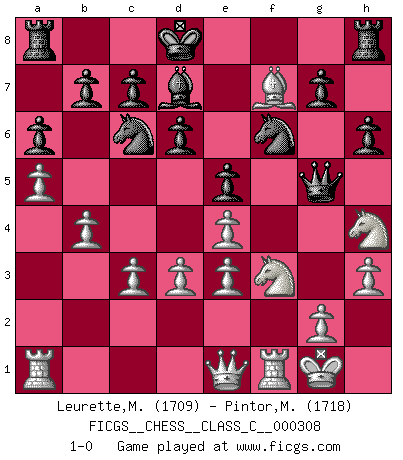 Last move : 1-0 2023 January 15 19:5:27 [Event "FICGS__CHESS__CLASS_C__000308"] [Site "FICGS"] [Date "2023.01.10"] [Round "1"] [White "Leurette,Marc-Antoine"] [Black "Pintor,Manuel"] [Result "1-0"] [WhiteElo "1709"] [BlackElo "1718"] 1.e4 e5 2.Nf3 Nc6 3.Bc4 Bc5 4.c3 Qf6 5.b4 Bb6 6.a4 a6 7.a5 Ba7 8.d3 h6 9.Be3 Bxe3 10.fxe3 d6 11.Nbd2 Bg4 12.h3 Bd7 13.O-O Qg6 14.Nh4 Qg5 15.Bxf7+ Kd8 16.Qe1 Nf6 17.Ndf3 1-0 Follow this game move after move (download)Chess holds its master in its own bonds, shackling the mind and brain so that the inner freedom of the very strongest must suffer. (Albert Einstein) Ein Isolani verdüstert die Stimmung auf dem ganzen Schachbrett. (Savielly Grigorievitsch Tartakower) La maestría del Ajedrez consiste esencialmente en analizar posiciónes de Ajedrez con precisión. (Mikhail Botvinnik) Tout change constamment, y compris dans le monde des Echecs. (Botvinnik) Pretend inferiority and encourage his arrogance. (Sun Tzu)