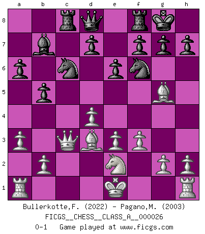 Last move : 0-1 2007 November 21 19:31:16 [Event "FICGS__CHESS__CLASS_A__000026"] [Site "FICGS"] [Date "2007.08.23"] [Round "1"] [White "Bullerkotte,Frank"] [Black "Pagano,Marcelo"] [Result "0-1"] [WhiteElo "2022"] [BlackElo "2003"] 1.d4 Nf6 2.c4 e6 3.Nc3 Bb4 4.Qc2 O-O 5.a3 Bxc3+ 6.Qxc3 b5 7.cxb5 c6 8.Bg5 cxb5 9.e3 Bb7 10.f3 a6 11.Bd3 Nc6 12.Ne2 Rc8 0-1 This chess game has been lost on time (started : 2007.08.23 15:22:22) Comment by player 2 : Marcelo Pagano : I wish to resign all my games in FICGS because I'm not satisfied with the level chess that i've have been played. So i'll wait you next move for resign! Kind regards! Nimzo-Indian : Classical, Adorjan gambit Kingside Castling by player Black (move 4) Player Black won this chess game. Follow this game move after move (download)Chess demands total concentration. (Bobby Fischer) Offener Brief an US-Präsident Bush anlässlich der Verhaftung Bobby Fishers: Verhaften Sie mich. Stecken Sie mich in dieselbe Zelle wie Bobby Fisher und geben Sie uns ein Schachspiel mit. (Boris Vassilievich Spassky) Morphy probablemente fue el genio más grande de todos. (Bobby Fischer) Pour se monter efficace, un Cavalier a besoin d'avant-postes ! Les Cavaliers font les meilleurs bloqueurs de pions passés. The next best thing to gambling and winning is gambling and loosing. (Nick Dandalos)