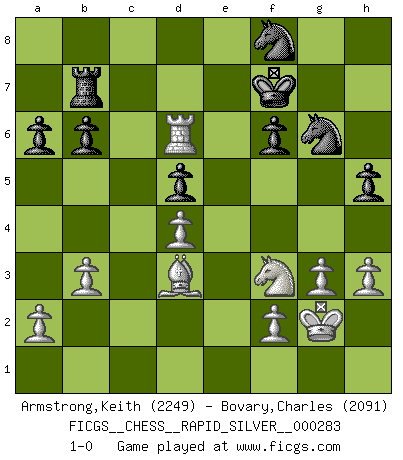 Last move : 1-0 2023 April 2 11:39:26 [Event "FICGS__CHESS__RAPID_SILVER__000283"] [Site "FICGS"] [Date "2023.01.16"] [Round "1"] [White "Armstrong,Keith"] [Black "Bovary,Charles"] [Result "1-0"] [WhiteElo "2249"] [BlackElo "2091"] 1.Nf3 d5 2.d4 Nf6 3.c4 c6 4.e3 e6 5.b3 Bd6 6.Bd3 b6 7.O-O Bb7 8.Nbd2 O-O 9.Qe2 Re8 10.Bb2 Nbd7 11.Rad1 Qc7 12.Rfe1 Rad8 13.Rc1 Qb8 14.h3 h6 15.Bb1 c5 16.cxd5 exd5 17.Red1 Rc8 18.Nh4 Bh2+ 19.Kh1 Bd6 20.Bd3 Qc7 21.Bb5 Bc6 22.Ba6 Bb7 23.Bd3 Bf8 24.Kg1 Qd8 25.Nhf3 Bd6 26.Bb5 Re6 27.Rc2 Nb8 28.Ne5 cxd4 29.Rxc8 Qxc8 30.Rc1 Qd8 31.exd4 Nbd7 32.Ndf3 Nf8 33.Nh4 g6 34.Nhf3 Ne4 35.Nd2 Nf6 36.Qf3 Qe7 37.Qe3 h5 38.Qh6 N6h7 39.Ndf3 f6 40.Nxg6 Qg7 41.Qxg7+ Kxg7 42.Ngh4 Kg8 43.Nf5 Bf4 44.Rd1 Ng6 45.g3 Bb8 46.Ba3 Nhf8 47.Rc1 a6 48.Bd3 Re8 49.Bd6 Bxd6 50.Nxd6 Re7 51.Kg2 Rd7 52.Nxb7 Rxb7 53.Rc6 Kf7 54.Rd6 1-0 Follow this game move after move (download)Via the squares on the chessboard, the Indians explain the movement of time and the age, the higher influences which control the world and the ties which link Chess with the human soul. (Al-Masudi) Es ist besser die Steine des Gegners zu opfern. (Savielly Grigorievitsch Tartakower) Si el Ajedrez es una ciencia, es la mas inexacta. Si el Ajedrez es un arte, es demasiado inexacto para ser visto como tal. Si el Ajedrez es un deporte, es demasiado esotérico. Si el Ajedrez es un juego, es demasiado exigente para ser solo un juego. Si el Ajedrez es una aventura, es una muy demandante. Si el Ajedrez es una pasión, es una muy gratificante. Si el Ajedrez es la vida, es una muy triste. (Anónimo) Les Echecs représentent une sphère d'idées créatrices basée sur la volonté des deux protagonistes. (Smyslov) Big Chess is a place for big hallucinations. (Thibault de Vassal)
