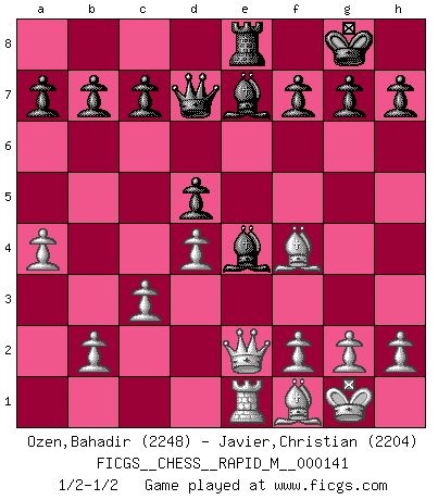 Last move : 1/2-1/2 2023 February 13 5:24:57 [Event "FICGS__CHESS__RAPID_M__000141"] [Site "FICGS"] [Date "2023.01.17"] [Round "1"] [White "Ozen,Bahadir"] [Black "Javier,Christian"] [Result "1/2-1/2"] [WhiteElo "2248"] [BlackElo "2204"] 1.e4 e5 2.Nf3 Nc6 3.Bb5 Nf6 4.O-O Nxe4 5.Re1 Nd6 6.Nxe5 Be7 7.Bf1 Nxe5 8.Rxe5 O-O 9.d4 Bf6 10.Re1 Re8 11.Bf4 Rxe1 12.Qxe1 Ne8 13.c3 d5 14.Nd2 Bf5 15.Qe3 Nd6 16.Qg3 Be7 17.Re1 Qd7 18.Qf3 Ne4 19.Nxe4 Bxe4 20.Qe2 Re8 21.a4 1/2-1/2 Follow this game move after move (download)Chess is a sea in which a gnat may drink and an elephant may bathe. (Hindu proverb) Lisa Lane, amerikanische Schachmeisterin, hatte Fischer einmal als stärksten lebenden Spieler bezeichnet. Antwort: Das ist richtig, aber Lisa Lane ist eigentlich nicht in der Lage, das zu beurteilen. (Robert James Fischer) Ciertamente, de todas la drogas del mundo, el Ajedrez debe ser el mas placentero permamentemente. (Assiac) Psychologiquement, tu dois avoir confiance en toi même, mais cette confiance doit être basée sur des faits. (Robert Fischer) Over-the-board chess is the favorite of mortals, correspondence chess is the favorite of the gods. (Eduard Dyckhoff)
