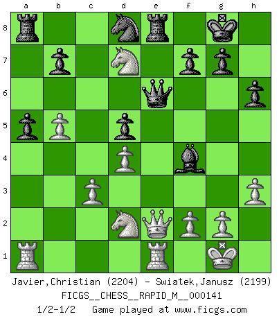 Last move : 1/2-1/2 2023 March 10 3:5:23 [Event "FICGS__CHESS__RAPID_M__000141"] [Site "FICGS"] [Date "2023.01.17"] [Round "1"] [White "Javier,Christian"] [Black "Swiatek,Janusz"] [Result "1/2-1/2"] [WhiteElo "2204"] [BlackElo "2199"] 1.e4 e6 2.Nf3 d5 3.exd5 exd5 4.d4 Nf6 5.Bd3 c5 6.O-O c4 7.Re1+ Be7 8.Bf1 O-O 9.c3 Nc6 10.b3 cxb3 11.axb3 Bg4 12.h3 Bh5 13.Bg5 h6 14.Bxf6 Bxf6 15.Bd3 Bg5 16.b4 Qf6 17.Be2 Rfe8 18.b5 Nd8 19.Nbd2 Bf4 20.Ne5 Bxe2 21.Qxe2 a5 22.Nd7 Qe6 1/2-1/2 Follow this game move after move (download)A Chess game is a dialogue, a conversation between a player and his opponent. Each move by the opponent may contain threats or be a blunder, but a player cannot defend against threats or take advantage of blunders if he does not first ask himself: What is my opponent planning after each move ? (Bruce A. Moon) In Buenos Aires ist es nicht mein vorrangiges Ziel ein starkes Turnier zu organisieren, sondern ein Turnier für Gentlemen. Ich würde nie Kamsky einladen. Ich mag keine Probleme. (Miguel Najdorf) La maestría del Ajedrez consiste esencialmente en analizar posiciónes de Ajedrez con precisión. (Mikhail Botvinnik) Les échecs sont un jeu terrible. Si vous n'avez pas le centre, votre adversaire a une position plus libre. Par contre, si vous avez le centre, alors vous avez vraiment quelque chose pour laquelle vous inquiéter ! (Siegbert Tarrasch) When you have everything, sometimes it feels like nothing. (Horatio Caine, C.S.I. Miami)