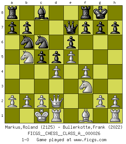 Last move : 1-0 2007 November 30 19:59:16 [Event "FICGS__CHESS__CLASS_A__000026"] [Site "FICGS"] [Date "2007.08.23"] [Round "1"] [White "Markus,Roland"] [Black "Bullerkotte,Frank"] [Result "1-0"] [WhiteElo "2125"] [BlackElo "2022"] 1.e4 e6 2.d4 d5 3.Nc3 Nf6 4.Bg5 Be7 5.e5 Nfd7 6.Bxe7 Qxe7 7.f4 O-O 8.Nf3 c5 9.Qd2 Nc6 10.O-O-O Nb6 11.Nb5 1-0 This chess game has been lost on time (started : 2007.08.23 15:22:22) French : Classical, Steinitz variation Kingside Castling by player Black (move 7) Queenside Castling by player White (move 10) Player White won this chess game. Follow this game move after move (download)Botvinnik tried to take the mystery out of Chess, always relating it to situations in ordinary life. He used to call Chess a typical inexact problem similar to those which people are always having to solve in everyday life. (Garry Kasparov) Ich könnte leicht behaupten: Ja,ja, Leonid Breschnew wollte nicht, daß ich Weltmeister werde. In der Tat war die Sache komplizierter. (Viktor Kortschnoi) Bobby solo arroja las piezas y solas caen en las casillas correctas. (Miguel Najdorf ) La vie et les Echecs sont tous les deux une lutte constante. (Lasker) The Internet is the world's largest library. It's just that all the books are on the floor. (John Allen Paulos)