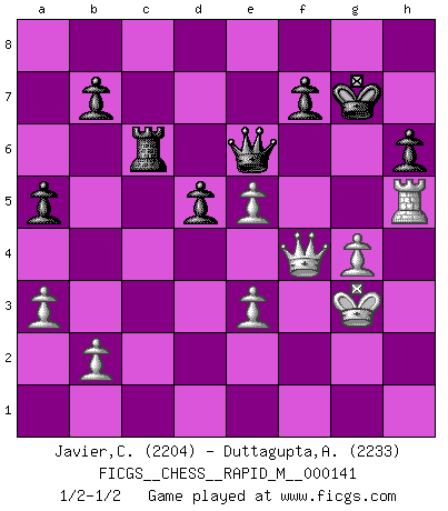 Last move : 1/2-1/2 2023 March 31 12:56:50 [Event "FICGS__CHESS__RAPID_M__000141"] [Site "FICGS"] [Date "2023.01.17"] [Round "1"] [White "Javier,Christian"] [Black "Duttagupta,Aniruddha"] [Result "1/2-1/2"] [WhiteElo "2204"] [BlackElo "2233"] 1.d4 Nf6 2.c4 g6 3.Nc3 d5 4.Nf3 Bg7 5.h4 c6 6.cxd5 cxd5 7.Bf4 Nc6 8.e3 O-O 9.Be2 Bg4 10.Qb3 Qd7 11.Ne5 Nxe5 12.dxe5 Ne4 13.f3 Nxc3 14.Qxc3 Rfc8 15.Qd4 Bf5 16.g4 Bc2 17.Kf2 Rc7 18.h5 e6 19.Kg3 Qe7 20.hxg6 Bxg6 21.Rad1 Rac8 22.Bd3 a5 23.a3 Rc5 24.Bh6 Bxh6 25.Rxh6 Rc1 26.Rdh1 Rxh1 27.Rxh1 Kg7 28.f4 Bxd3 29.Qxd3 h6 30.f5 exf5 31.Qxf5 Rc4 32.Rh5 Rc6 33.Qf4 Qe6 1/2-1/2 Follow this game move after move (download)Good offense and good defense both begin with good development. (Bruce A. Moon) Obendrein hat der FIDE-Präsident den Revolutionsführer Gaddafi zum »Großmeister« ernannt, am Ende der WM. Das ist lächerlich! (Joel Lautier) Todo se encuentra en un estado de flujo y esto incluye al mundo del Ajedrez. (Mikhail Botvinnik) Aidez vos pièces, elles vous aideront. (Paul Morphy) Perfection is achieved, not when there is nothing more to add, but when there is nothing left to take away. (Antoine de Saint-Exupéry)