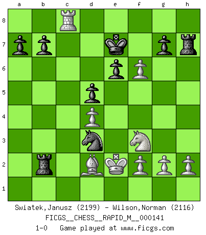 Last move : 1-0 2023 March 3 10:4:40 [Event "FICGS__CHESS__RAPID_M__000141"] [Site "FICGS"] [Date "2023.01.17"] [Round "1"] [White "Swiatek,Janusz"] [Black "Wilson,Norman"] [Result "1-0"] [WhiteElo "2199"] [BlackElo "2116"] 1.e4 e6 2.d4 d5 3.Nc3 Bb4 4.e5 c5 5.a3 Bxc3+ 6.bxc3 Nc6 7.Qg4 Kf8 8.a4 Nge7 9.Nf3 cxd4 10.cxd4 Nb4 11.Rb1 Nxc2+ 12.Kd2 Bd7 13.Kxc2 Bxa4+ 14.Kd2 Qa5+ 15.Ke2 Bb5+ 16.Kd1 Ba4+ 17.Ke2 Bb5+ 18.Rxb5 Qxb5+ 19.Ke3 Qb3+ 20.Bd3 Rc8 21.Bd2 Rc2 22.Ke2 Rb2 23.Rc1 Nc6 24.Qf4 Nb4 25.Bxh7 Rxh7 26.Rc8+ Ke7 27.Qg5+ f6 28.Qg6 Qd3+ 29.Qxd3 Nxd3 30.exf6+ 1-0 Follow this game move after move (download)Mistrust is the most necessary characteristic of the Chess player. (Siegbert Tarrasch) Schach ist gnadenlos. Du mußt bereit sein zu töten. (Nigel Short) Cada Peón es una Reina en potencia. (James Mason) Tout change constamment, y compris dans le monde des Echecs. (Botvinnik) The general who wins the battle makes many calculations in his temple before the battle is fought. The general who loses makes but few calculations beforehand. (Sun Tzu)