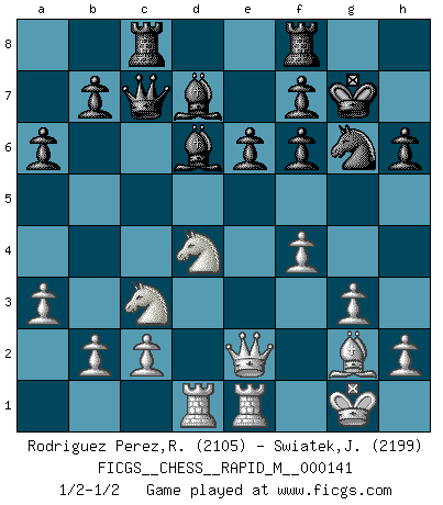 Last move : 1/2-1/2 2023 March 19 17:5:27 [Event "FICGS__CHESS__RAPID_M__000141"] [Site "FICGS"] [Date "2023.01.17"] [Round "1"] [White "Rodriguez Perez,Rene"] [Black "Swiatek,Janusz"] [Result "1/2-1/2"] [WhiteElo "2105"] [BlackElo "2199"] 1.e4 e6 2.d4 d5 3.Bd3 dxe4 4.Bxe4 Nf6 5.Bf3 c5 6.Ne2 Be7 7.O-O O-O 8.Nbc3 Nc6 9.Be3 cxd4 10.Nxd4 Ne5 11.Re1 Bb4 12.Rb1 a6 13.a3 Bd6 14.Bg5 Qc7 15.Qe2 Bd7 16.Rbd1 Rac8 17.g3 h6 18.Bxf6 gxf6 19.Bg2 Kg7 20.f4 Ng6 1/2-1/2 Follow this game move after move (download)For surely of all the drugs in the world, Chess must be the most permanently pleasurable. (Assiac) Zu meiner Zeit war ein 20 jähriger ein junger Spieler, heute ist er ein Veteran. (Garry Kasparov) Aquel que ve no otra dirección en el juego que la de dar Jaque Mate a su oponente, nunca será un buen jugador de Ajedrez. (Euwe) La conception d'un plan est le processus par lequel un joueur exploite les avantages de sa position tout en s'efforçant d'en réduire au minimum les inconvénients. Afin de garantir le succès, un plan doit toujours se fonder sur un diagnostic objectif des particularités d'une position. La conception d'un plan est d'autant plus difficile que la position est équilibrée, et grandement facilitée lorsqu'il n'existe qu'un seul plan susceptible de répondre aux exigences de la position. (Harry Golombek) There are 10 types of people in this world: those who understand binary and those who don't. (Anonymous)