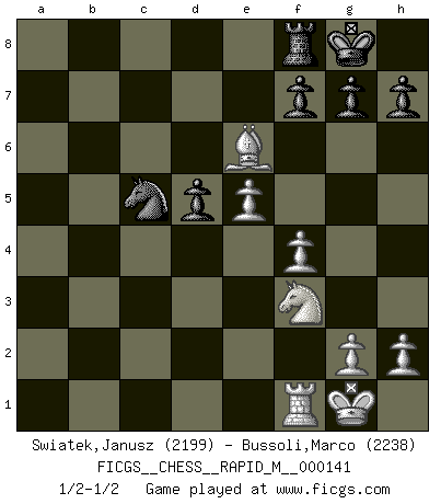 Last move : 1/2-1/2 2023 February 12 22:22:58 [Event "FICGS__CHESS__RAPID_M__000141"] [Site "FICGS"] [Date "2023.01.17"] [Round "1"] [White "Swiatek,Janusz"] [Black "Bussoli,Marco"] [Result "1/2-1/2"] [WhiteElo "2199"] [BlackElo "2238"] 1.e4 e6 2.d4 d5 3.Nc3 Nf6 4.e5 Nfd7 5.f4 c5 6.Nf3 Nc6 7.Be3 a6 8.Qd2 b5 9.a3 Qa5 10.Be2 b4 11.Nd1 Rb8 12.O-O bxa3 13.Qxa5 Nxa5 14.dxc5 axb2 15.Nxb2 Rxb2 16.Rxa5 Rxc2 17.Bxa6 Bxc5 18.Bxc5 Rxc5 19.Rxc5 Nxc5 20.Bxc8 O-O 21.Bxe6 1/2-1/2 Follow this game move after move (download)You know, comrade Pachman, I don't enjoy being a Minister, I would rather play Chess like you. (Che Guevara) Das Zentrum ist der Balkan des Schachbretts - Kriegshandlungen können in jedem Moment ausbrechen. (Aaron Nimzowitsch) Debes de llevar a tu oponente hacia un profundo y obscuro bosque donde 2+2=5, y el camino que conduce a la salida es suficientemente ancho para solamente uno. (Mikhail Tal) Il s'avisa de me proposer d'apprendre les échecs qu'il jouait un peu... me voilà forcené des échecs. J'achète un échiquier, je m'enferme dans ma chambre, j'y passe des jours et des nuits à vouloir apprendre par cur toutes les parties. (Jean-Jacques Rousseau, Confessions) Now you put water in a cup, it becomes the cup; You put water into a bottle it becomes the bottle; You put it in a teapot it becomes the teapot. Water can flow or it can crash. Be water, my friend. (Bruce Lee)