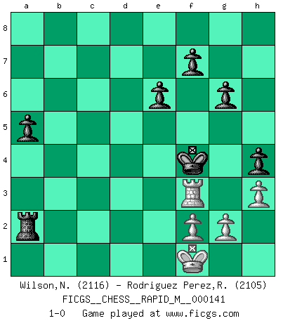 Last move : 1-0 2023 April 23 21:45:18 [Event "FICGS__CHESS__RAPID_M__000141"] [Site "FICGS"] [Date "2023.01.17"] [Round "1"] [White "Wilson,Norman"] [Black "Rodriguez Perez,Rene"] [Result "1-0"] [WhiteElo "2116"] [BlackElo "2105"] 1.d4 d5 2.e3 Nf6 3.Nf3 e6 4.c4 Bd6 5.c5 Be7 6.b4 b6 7.Ba3 O-O 8.Bd3 c6 9.O-O a5 10.b5 cxb5 11.Bxb5 bxc5 12.Bxc5 Bxc5 13.dxc5 Bd7 14.Nc3 Qe7 15.Bxd7 Nfxd7 16.e4 dxe4 17.Nxe4 Nxc5 18.Nxc5 Qxc5 19.Rc1 Qa3 20.Qc2 Nd7 21.Rfd1 Nb6 22.Ng5 g6 23.Ne4 Rfc8 24.Nf6+ Kg7 25.Qd2 Kxf6 26.Qd4+ Ke7 27.Rxc8 Rxc8 28.Qxb6 Qd3 29.Qb7+ Kf6 30.Qb2+ Qc3 31.Qb1 Rc4 32.h3 Rb4 33.Qd3 Qxd3 34.Rxd3 h5 35.Rd2 Ra4 36.Kf1 h4 37.Rc2 Ke5 38.Re2+ Kf4 39.Re3 Rxa2 40.Rf3+ 1-0 Follow this game move after move (download)An attack on the wing should be met by play in the center. (Nimzovitch) Frage: Wie viele Autos haben Sie schon zerstört? - Antwort: Nur zwei. (Loek van Wely) De todos mis libros Rusos, la defensa contiene y difunde el 'calor' mas grande que pudiese verse extraño al observar lo supremamente abstracto que el Ajedrez supuestamente es. (Vladimir Nabokov) Un journaliste : 'Vous préférez avoir une dame de plus sur l'échiquier ou au lit ?' Boris Spassky : 'Ca dépend de la position.' Panic is a sudden desertion of us, an a going over to the enemy of our imagination. (Christian Nevell Bovee)