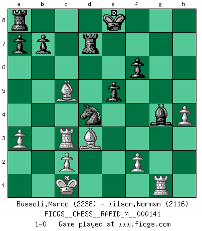 Last move : 1-0 2023 February 8 11:16:53 [Event "FICGS__CHESS__RAPID_M__000141"] [Site "FICGS"] [Date "2023.01.17"] [Round "1"] [White "Bussoli,Marco"] [Black "Wilson,Norman"] [Result "1-0"] [WhiteElo "2238"] [BlackElo "2116"] 1.e4 e6 2.d4 d5 3.Nc3 Bb4 4.e5 Ne7 5.a3 Bxc3+ 6.bxc3 c5 7.Qg4 Qc7 8.Qxg7 Rg8 9.Qxh7 cxd4 10.Ne2 dxc3 11.h4 Qxe5 12.Bf4 Qf6 13.Bg5 Qe5 14.Bxe7 Rh8 15.Bd6 Qxe2+ 16.Bxe2 Rxh7 17.g4 Nc6 18.O-O-O e5 19.Rxd5 Be6 20.Rc5 f6 21.Rxc3 Nd4 22.Bd3 Rd7 23.Bc5 Bxg4 24.Rg1 1-0 Follow this game move after move (download)Chess demands total concentration. (Bobby Fischer) Schach ist eine Sache der genauen Beurteilung, wann man zuschlagen und wann man sich ducken muss. (Robert James Fischer) Una partida de Ajedrez se divide en 3 etapas: la primera cuando piensas que tienes la ventaja, la segunda cuando crees que tienes la ventaja y la tercera... ¡cuando te das cuenta que vas a perder!. (Savielly Tartakower) La tactique, c'est ce que vous faites quand il y a quelque chose à faire; la stratégie, c'est ce que vous faites quand il n'y a rien à faire. (Savielli Tartacower) Games, world of games... There's always an opponent, and there's always a victim. (Revolver, movie)