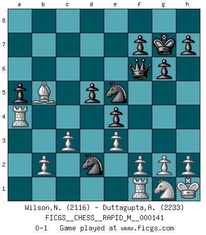 Last move : 0-1 2023 March 4 9:38:42 [Event "FICGS__CHESS__RAPID_M__000141"] [Site "FICGS"] [Date "2023.01.17"] [Round "1"] [White "Wilson,Norman"] [Black "Duttagupta,Aniruddha"] [Result "0-1"] [WhiteElo "2116"] [BlackElo "2233"] 1.d4 Nf6 2.c3 e6 3.Bf4 d5 4.e3 Bd6 5.Bxd6 Qxd6 6.Nf3 c5 7.dxc5 Qxc5 8.Nbd2 O-O 9.Be2 Nc6 10.O-O e5 11.Nb3 Qe7 12.Qc2 g6 13.Kh1 Bf5 14.Qd1 Rad8 15.Qe1 Kg7 16.Nh4 Be6 17.Nf3 a6 18.Rc1 b5 19.Ra1 Rb8 20.Ng5 Bf5 21.Qd1 a5 22.Nf3 Rfc8 23.a4 bxa4 24.Rxa4 Ne4 25.Bd3 Rxb3 26.Qxb3 Nc5 27.Bxf5 Nxb3 28.Bxc8 e4 29.Ng1 Qf6 30.Bd7 Ne5 31.Bb5 Nd2 0-1 Follow this game move after move (download)A good player is always lucky. (Jose Raul Capablanca) Wenn Du absolut nicht mehr weißt, was Du tun sollst, dann ist es Zeit für Panik. (John van der Wiel) Siempre es mucho mejor sacrificar las piezas de tu oponente. (Savielly Tartakover) Le pion, dans sa simplicité, marche droit devant lui, mais lorsqu'il prend, il le fait obliquement? Ainsi l'homme, tant qu'il reste pauvre, marche dans la droiture et vit honnêtement, mais lorsqu'il recherche les honneurs, il flatte, se parjure et, par les voies obliques, cherche une position supérieure sur l'échiquier du monde. (Jean de Galles) Everybody lies. (Gregory House, House M.D.)