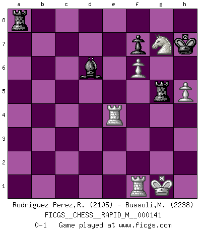 Last move : 0-1 2023 June 4 12:20:51 [Event "FICGS__CHESS__RAPID_M__000141"] [Site "FICGS"] [Date "2023.01.17"] [Round "1"] [White "Rodriguez Perez,Rene"] [Black "Bussoli,Marco"] [Result "0-1"] [WhiteElo "2105"] [BlackElo "2238"] 1.e4 c5 2.Nf3 d6 3.d4 cxd4 4.Qxd4 Nf6 5.Nc3 Nc6 6.Bb5 Bd7 7.Bxc6 Bxc6 8.Bg5 e6 9.Qd3 h6 10.Bxf6 Qxf6 11.Nd4 Be7 12.O-O Qe5 13.Rad1 O-O 14.b4 Qh5 15.f4 Rac8 16.a3 a5 17.f5 axb4 18.axb4 d5 19.exd5 Bxd5 20.Nxd5 exd5 21.Ne2 Bxb4 22.Nf4 Qg4 23.h3 Qg5 24.Nxd5 Rfd8 25.Kh1 Bd6 26.Rb1 Rb8 27.Rb5 Qh4 28.Nc3 b6 29.Nd5 Re8 30.R5b1 h5 31.Rbd1 Bc5 32.Qb5 Re4 33.Qd7 Rf8 34.Qc6 Bd4 35.f6 g6 36.Qc7 Be5 37.Qxb6 Re2 38.Qg1 Kh7 39.Rfe1 Bd4 40.Qf1 Rf2 41.Qd3 Qg5 42.Rg1 Be5 43.Rde1 Bd6 44.c4 Ra2 45.Qe3 Qxe3 46.Nxe3 Bc5 47.Rgf1 Ra4 48.Nd1 Rxc4 49.Nf2 Kh6 50.Re4 Rc2 51.Nd3 Bd6 52.Ne5 g5 53.Kg1 Rd2 54.h4 gxh4 55.Nf3 Rc2 56.Nxh4 Rg8 57.Nf5+ Kh7 58.Ng7 Rc5 59.g4 Ra8 60.gxh5 Rg5+ 0-1 This chess game has been lost on time (started : 2023.01.17 10:49:4) Follow this game move after move (download)In Chess, at least, the brave inherit the earth. (Edmar Mednis) Ein bischen Romantik kann weder im Schach noch in der Liebe schaden. Also versuche ich mich ab und zu daran zu erinnern. (Nigel Short) Alekhine es un poeta que crea un trabajo de arte de algo que raramente inspiraría a otra persona a mandar una tarjeta postal. (Max Euwe) Donnez-moi un Cavalier en 6e et je gagnerais toutes mes parties. (Steinitz) History is a gallery of pictures in which there are few originals and many copies. (Alexis de Tocqueville)