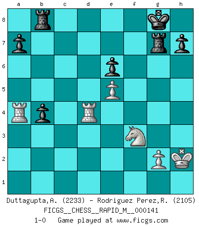 Last move : 1-0 2023 May 28 15:3:22 [Event "FICGS__CHESS__RAPID_M__000141"] [Site "FICGS"] [Date "2023.01.17"] [Round "1"] [White "Duttagupta,Aniruddha"] [Black "Rodriguez Perez,Rene"] [Result "1-0"] [WhiteElo "2233"] [BlackElo "2105"] 1.d4 d5 2.Nf3 Nf6 3.Bf4 e6 4.e3 c5 5.Nbd2 Nc6 6.c3 Bd6 7.Bg3 O-O 8.Bd3 b6 9.e4 Be7 10.e5 Nh5 11.Ng5 Bxg5 12.Qxh5 g6 13.Qe2 cxd4 14.h4 Bh6 15.h5 dxc3 16.bxc3 Bg7 17.f4 Rb8 18.Rc1 Rb7 19.Bh4 Qc7 20.O-O Qd7 21.Rf3 Rc7 22.Rh3 Bb7 23.Nf3 d4 24.h6 Bh8 25.Rd1 Ne7 26.Bxe7 Qxe7 27.cxd4 Bd5 28.Kh2 f6 29.Be4 Bc4 30.Qf2 b5 31.Qg3 Qf7 32.Nh4 fxe5 33.Bxg6 Qxf4 34.Bh5 Bg7 35.hxg7 Rxg7 36.Qxf4 Rxf4 37.dxe5 Bxa2 38.Rd8+ Rf8 39.Rd4 Rb8 40.Ra3 Bd5 41.Bf3 Bxf3 42.Nxf3 b4 43.Ra4 1-0 This chess game has been lost on time (started : 2023.01.17 10:49:4) Follow this game move after move (download)Chess problems demand from the composer the same virtues that characterize all worthwhile art: originality, invention, conciseness, harmony, complexity, and splendid insincerity. (Vladimir Nabokov) Wenn Du nicht kämpfst, um anderen etwas zu beweisen, sondern nur für Dich selbst, dann bist du fast unbesiegbar. (Garry Kasparov) El Ajedrez es un regaderazo frío para la mente. (Sir John Simon) Les Cavaliers se révèlent fort utiles dans les positions fermées. D'habitude, les Fous sont un peu plus forts que les Cavaliers dans les positions ouvertes. Qu'on le veuille ou non, il restera toujours des exceptions ! Logic : The art of thinking and reasoning in strict accordance with the limitations and incapacities of the human misunderstanding. (Ambrose Bierce)