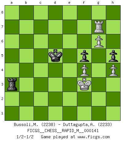 Last move : 1/2-1/2 2023 May 1 20:23:25 [Event "FICGS__CHESS__RAPID_M__000141"] [Site "FICGS"] [Date "2023.01.17"] [Round "1"] [White "Bussoli,Marco"] [Black "Duttagupta,Aniruddha"] [Result "1/2-1/2"] [WhiteElo "2238"] [BlackElo "2233"] 1.d4 d5 2.c4 c6 3.Nf3 Nf6 4.e3 e6 5.Nbd2 Be7 6.b3 O-O 7.Bb2 b6 8.Bd3 Bb7 9.O-O Nbd7 10.Qe2 c5 11.Rfd1 h6 12.cxd5 Nxd5 13.Rac1 cxd4 14.Nxd4 Rc8 15.Bc4 N7f6 16.a3 Bc5 17.N4f3 a5 18.g3 Nd7 19.e4 N5f6 20.e5 Nd5 21.Ne4 Qe7 22.Nd4 Nxe5 23.Bxd5 Bxd5 24.Nxc5 bxc5 25.Nf5 exf5 26.Rxd5 Ng6 27.Qxe7 Nxe7 28.Rdxc5 Rxc5 29.Rxc5 Rb8 30.Be5 Rxb3 31.Bd6 Ng6 32.Rxa5 f4 33.a4 f6 34.gxf4 Kf7 35.Kg2 Ke6 36.f5+ Kxd6 37.fxg6 Ke6 38.Rb5 Ra3 39.a5 f5 40.f4 h5 41.h4 Ra2+ 42.Kg3 Ra3+ 43.Kf2 Ra4 44.Kf3 Ra2 45.Ke3 Ra4 46.Rc5 Re4+ 47.Kf3 Ra4 48.Rc6+ Kd5 49.Rc7 Rxa5 50.Rxg7 Ra3+ 1/2-1/2 Follow this game move after move (download)Why must I lose to this idiot ? (Aron Nimzovich) Mutter, ich bin eben Ex-Weltmeister geworden. --beim nach Hause Kommen nach dem Verlust des WM-Titels an Mihail Botvinnik -- (Mikhail Nekhemyevich Tal) En el Ajedrez, cuando menos, el valiente hereda la tierra. (Edmar Mednis) Il (Jacob Murray) ne joue pas pour le bon coup, mais pour le meilleur. (Eloi Relange) Players are not good because they find tactics, it is about the way to find the positions in which those tactics are hidden. (Luc-Olivier Leclerc)